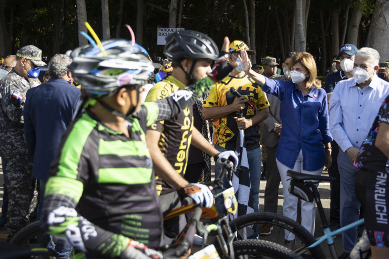 La vicepresidenta Raquel Peña encabezó el acto de celebración del séptimo clásico de Patrón Santiago, bajo la visión 2021, dedicada al respeto al ciclista, exhortando a los conductores a mantenerse a 1.5 metros de los pedalistas que circulan por las calles. Santiago, República Dominicana. 31 de Octubre 2021. Vp/ Jhon Escalante