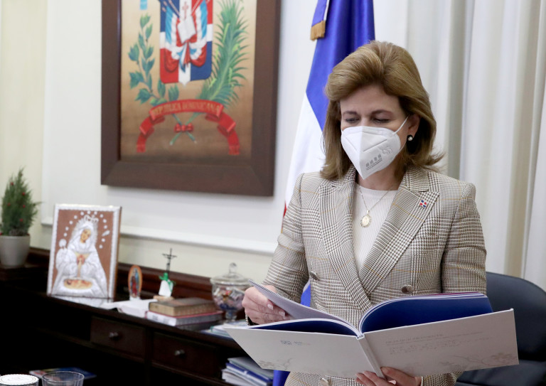 La vicepresidenta Raquel Peña se reúne con los Sres. Lawrence Hazoury, Gustavo Ariza y Mildred Minaya, ejecutivos de la Asociación Popular de Ahorros y Préstamos (APAP) para recibir una copia del libro «El mundo que miran mis ojos, que tocan mis manos».