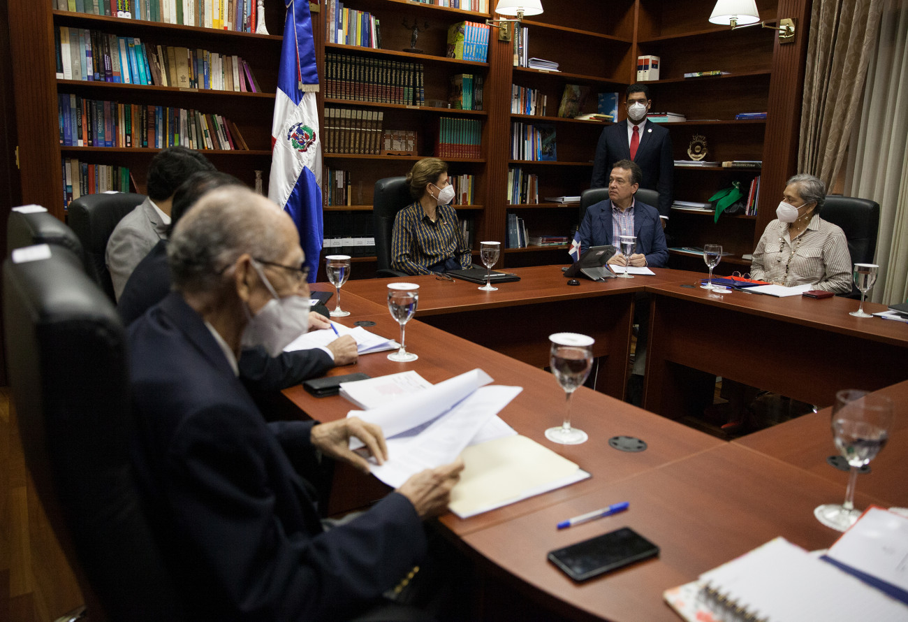 La vicepresidenta Raquel Peña, se reunió con el ministro de industria y comercio, Victor Bisonó, Hugo Rivera viceministro de Asuntos Economicos y Cooperación Internacional del Mirex, Sra. Vilma Arbaje, viceministra de Comercio Exterior del Ministerio de Industria comercio y mipymes, Manuel Diaz Franjul, director de negociaciones comerciales del MIREX. Santo Domingo, República Dominicana. 03 de Diciembre 2021. Vp/ Modesto Rabassa