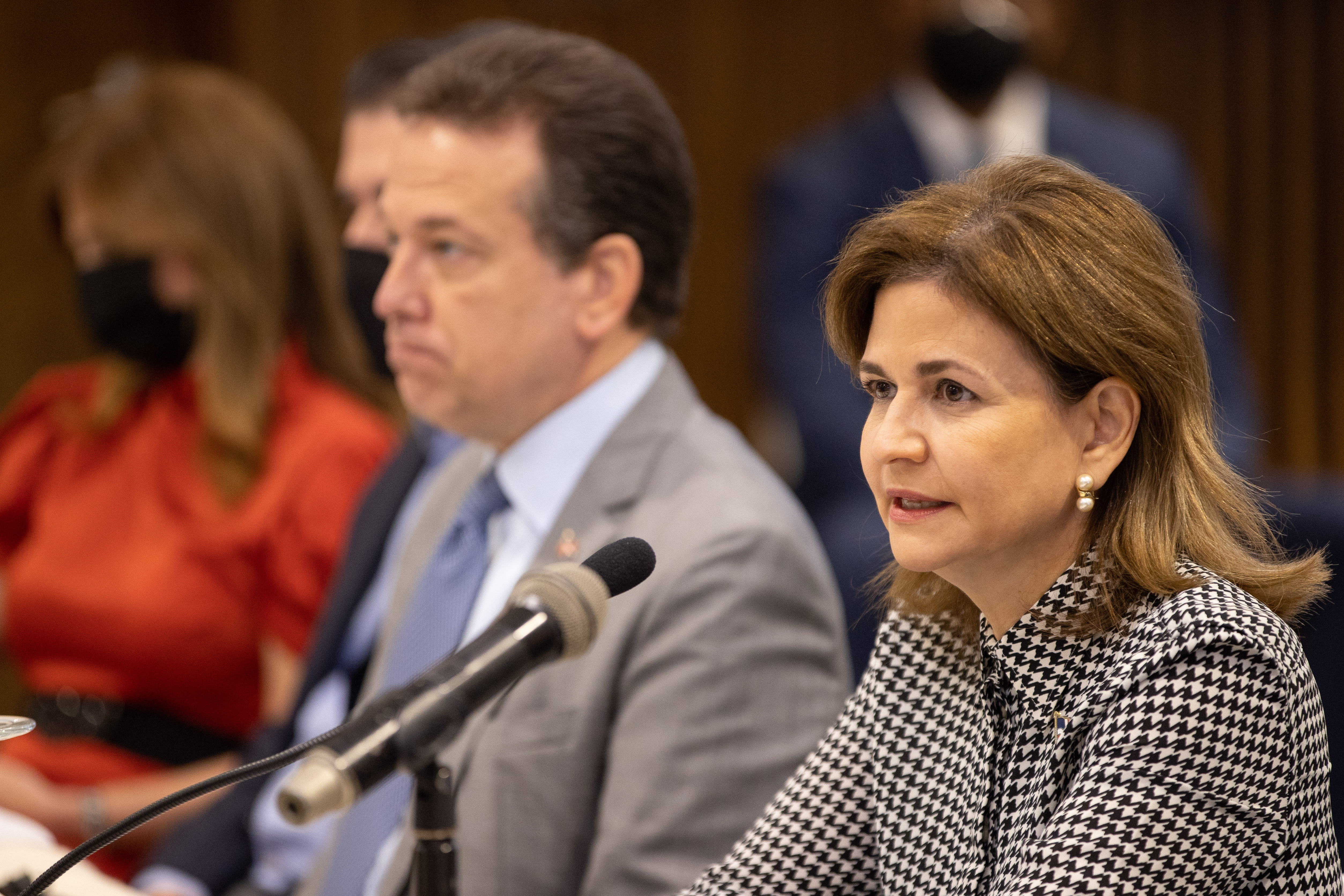 La vicepresidenta Raquel Peña encabezo junto a Ito Bisonó, ministro de industria y comercio y el Sr. Celso Marranzini, presidente del AIRD, un conversatorio con los Directivos de Asociación de Industrias de la República Dominicana. Santo Domingo, República Dominicana. 14 de Diciembre 2021. Vp/ Jhon Escalante