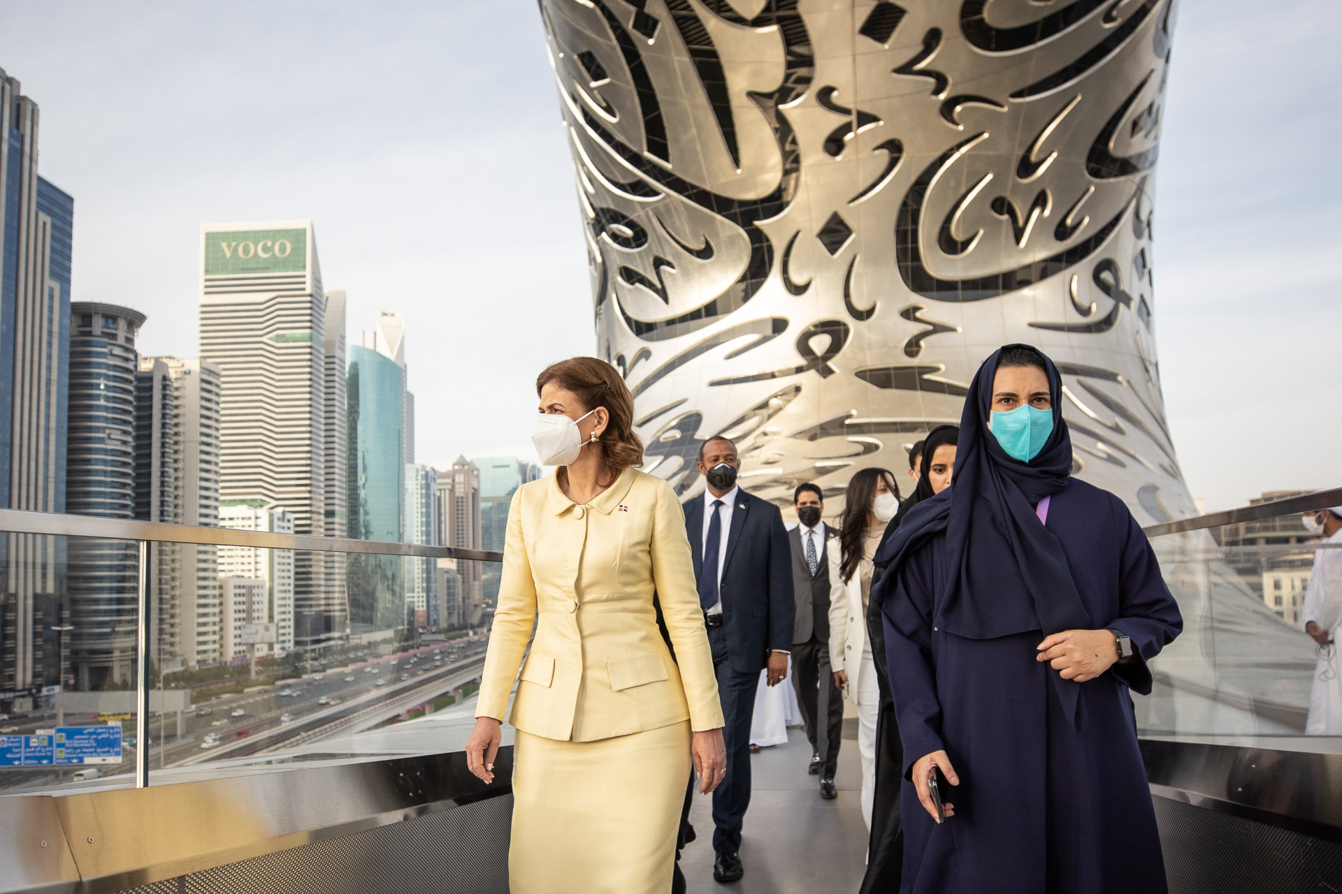 La vicepresidenta Raquel Peña visitó el Museo del Futuro en Dubái, que recientemente abrió oficialmente sus puertas y cuenta con una estructura de siete pisos que imagina un mundo de ensueño impulsado por energía solar. Emiratos Árabes Unidos. Dubai. 04 de Marzo 2022. Vp/ Jhon Escalante