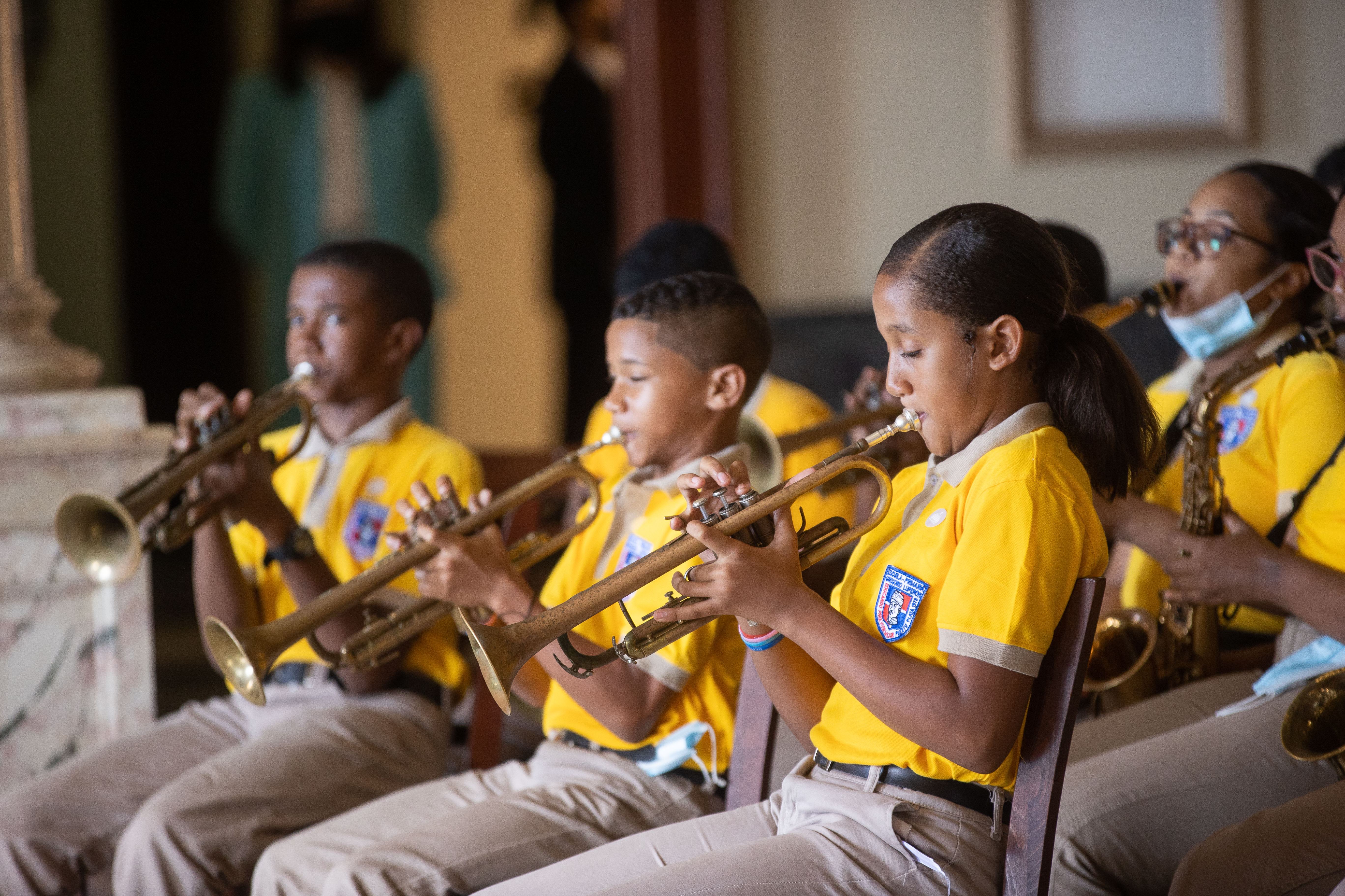 La vicepresidenta Raquel Peña y funcionarios del Gobierno dominicano, recibieron a estudiantes de la escuela primaria Gregorio Luperón de la provincia Puerto Plata. Escuela que tiene el fin de modelo en artes en música por el Ministerio de Educación de la República Dominicana donde realizaron un acto musical en el Palacio Nacional. Santo Domingo, República Dominicana. 9 de Marzo 2022. Vp/ Jhon Escalante