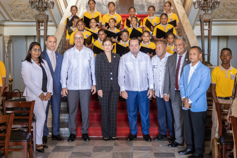 La vicepresidenta Raquel Peña y funcionarios del Gobierno dominicano, recibieron a estudiantes de la escuela primaria Gregorio Luperón de la provincia Puerto Plata. Escuela que tiene el fin de modelo en artes en música por el Ministerio de Educación de la República Dominicana donde realizaron un acto musical en el Palacio Nacional. Santo Domingo, República Dominicana. 9 de Marzo 2022. Vp/ Jhon Escalante