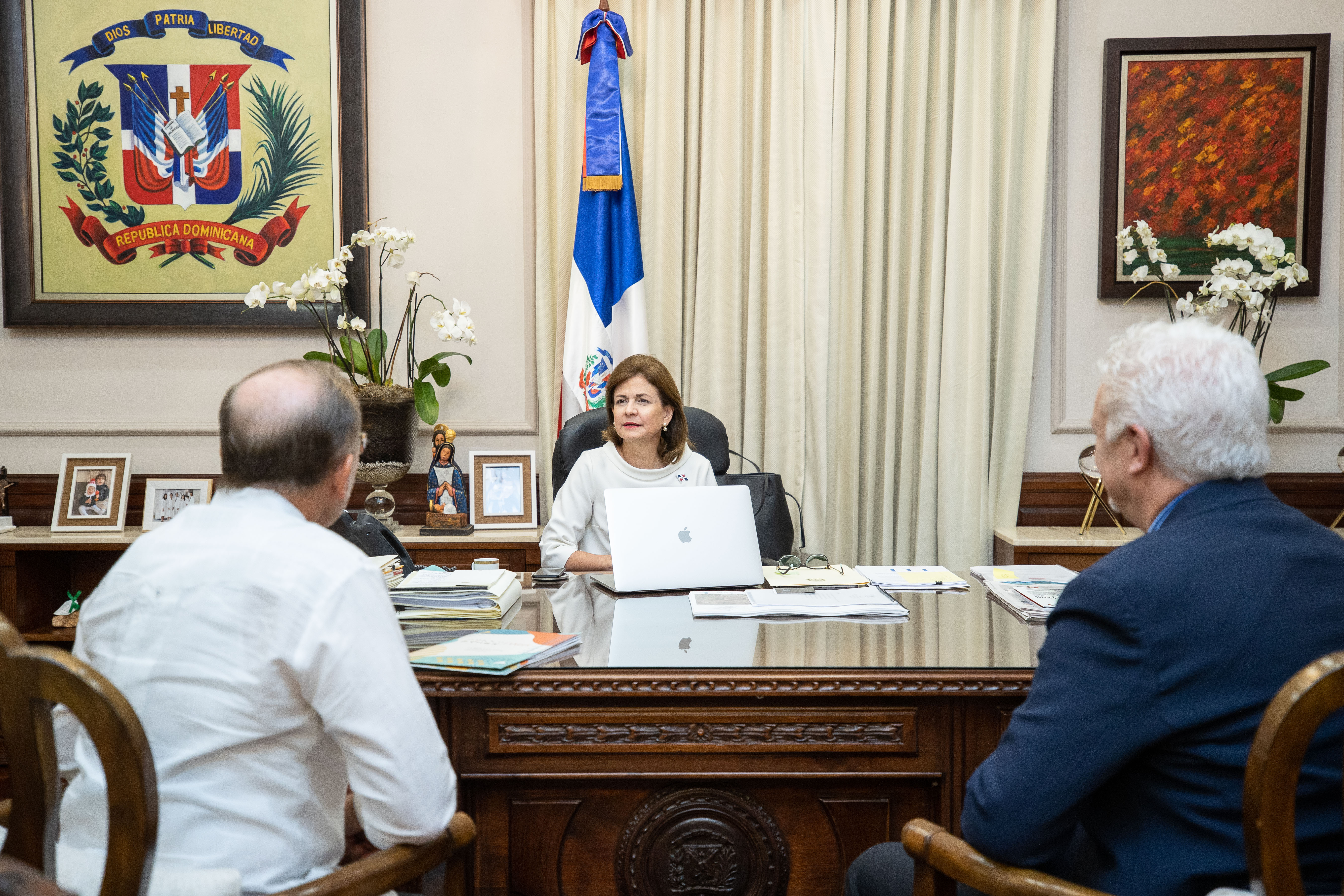 La vicepresidenta Raquel Peña recibió en su despacho a los Sres. Ignacio Méndez y Rodolfo Ganna. Conversaron sobre alternativas de alianza con el sector público, para extender a todo el país la plataforma de apoyo a emprendedores de Pyhex Work. Santo Domingo, República Dominicana. 22 de Marzo 2022. Vp/ Jhon Escalante