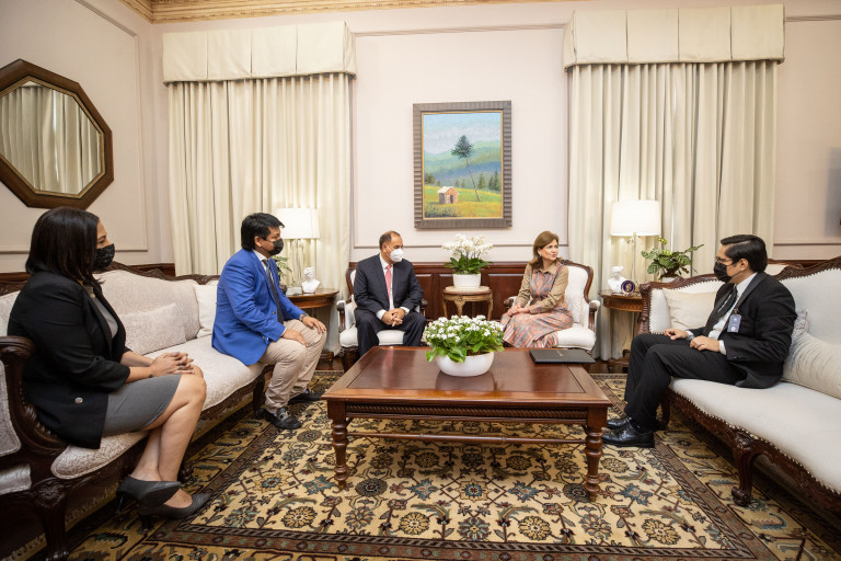 La vicepresidenta Raquel Peña recibió la visita de Jorge Añaños, Arturo Marroquín, Lizzie González y Erick Mónico. La mandataria y las altas autoridades de Industrias San Miguel, conversaron sobre cómo trabajan para afianzar su compromiso con la calidad y la sostenibilidad en la República Dominicana. Santo Domingo, República Dominicana. 25 de Marzo 2022. Vp/ Jhon Escalante