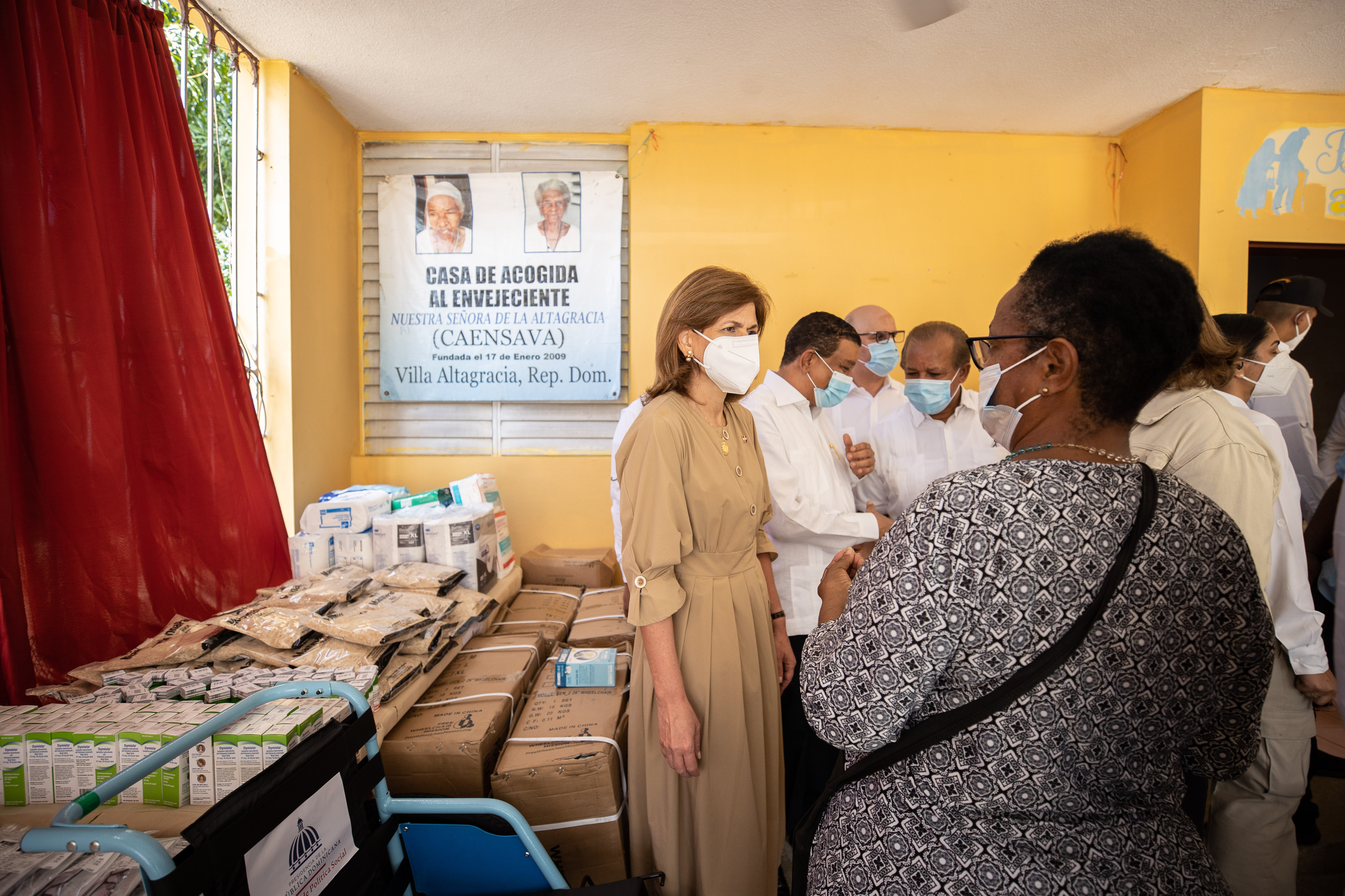 La vicepresidenta Raquel Peña visitó la casa de acogida al envejeciente «Nuestra Señora de la Altagracia» para la entrega de medicamentos, alimentos vitaminados, sillas de ruedas, muletas, lentillas y productos de higiene. La actividad fue organizada por el Gabinete de Coordinación de Políticas Sociales. Villa Altagracia, República Dominicana. 08 de Abril 2022. Vp/ Jhon Escalante