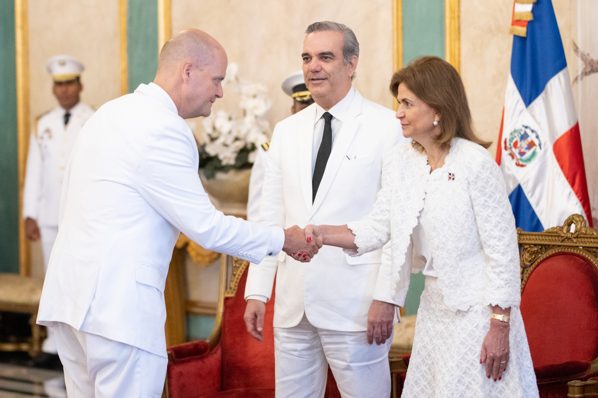 El presidente Luis Abinader y la vicepresidenta Raquel Peña, en compañía del viceministro de Política Exterior Bilateral del Ministerio de Relaciones Exteriores (MIREX), el señor José Julio Gómez, asistieron al acto de presentación de las cartas credenciales de embajadoras y embajadores que iniciarán sus labores en el país. El conjunto diplomático agradeció a las altas autoridades por el recibimiento y la distinción de representar a su país en la República Dominicana. Santo Domingo, República Dominicana. 21 de Abril 2022. Vp/ Jhon Escalante