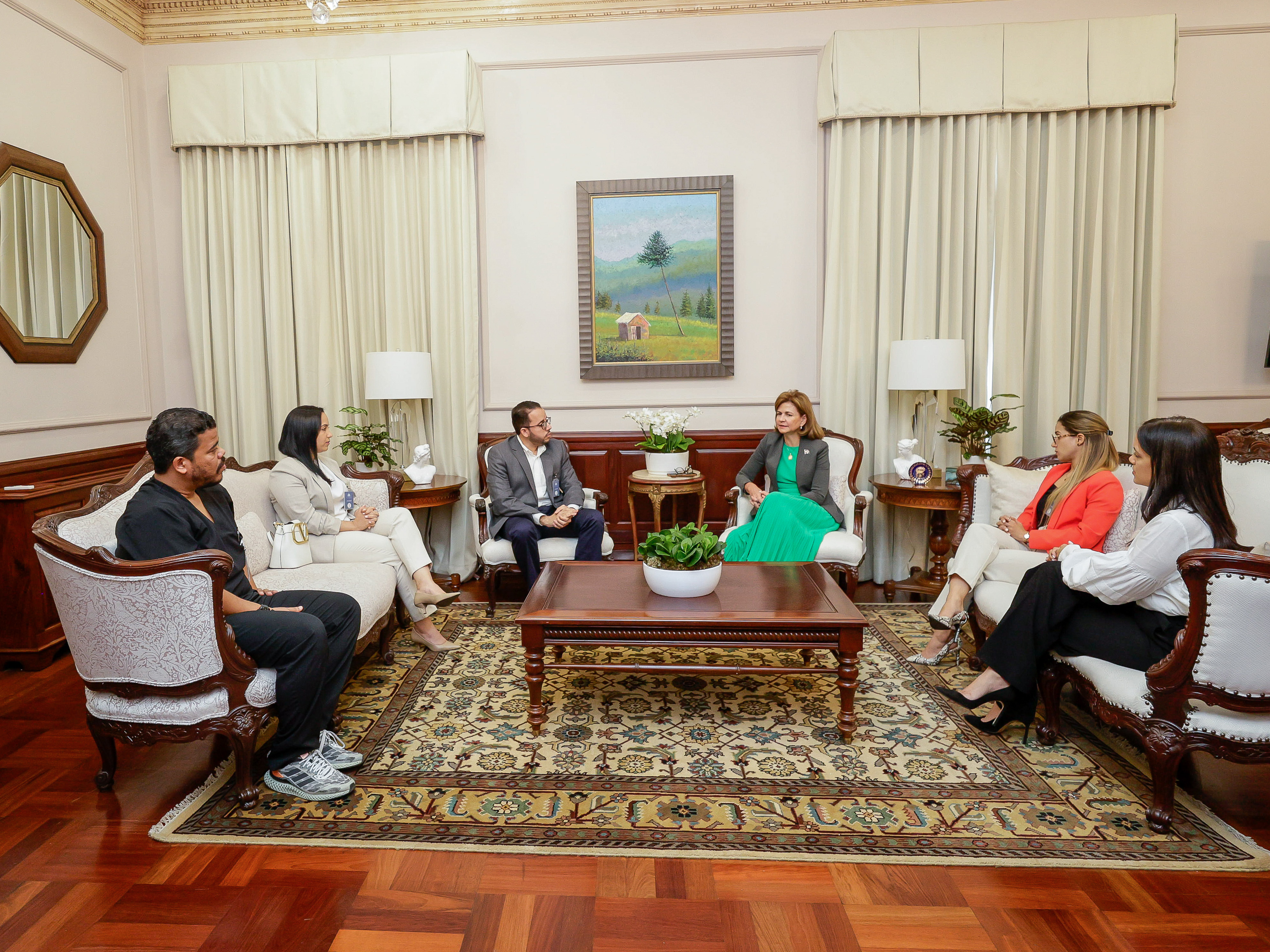 La vicepresidenta Raquel Peña recibió la visita de una comisión encabezada por el doctor Anthony Plutarco Arias, las señoras Vanessa Hernández y Mabel Montás, y el señor Ramsés Caraballo. Conversaron acerca de temas relacionados al sector Salud y sobre la implementación de un proyecto en beneficio a personas con discapacidad auditiva. Santo Domingo, República Dominicana, 05 de Mayo 2022. Vp/ FUENTE EXTERNA