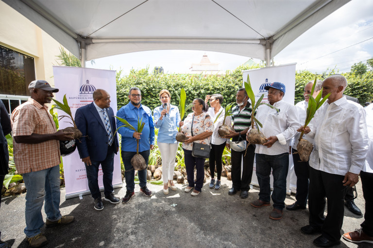 La vicepresidenta Raquel Peña hizo entrega de plántulas de coco a productores de Montecristi, con el fin de potenciar su cultivo en la región noroeste. Montecristi, República Dominicana, 27 de Mayo 2022. Vp/ Jhon Escalante