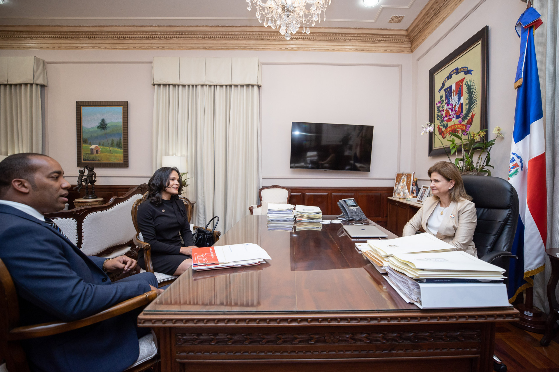 A fin de conocer las iniciativas que tiene en agenda el Consejo Nacional de Población y Familia (CONAPOFA), la vicepresidenta Raquel Peña sostuvo un encuentro con su director, Obed Fabíá y la Dra. Yakaira García, en el que intercambiaron ideas sobre el estudio y análisis de la proyección poblacional en el país. Santo Domingo, República Dominicana, 25 de Agosto 2022. Vp/ Jhon Escalante