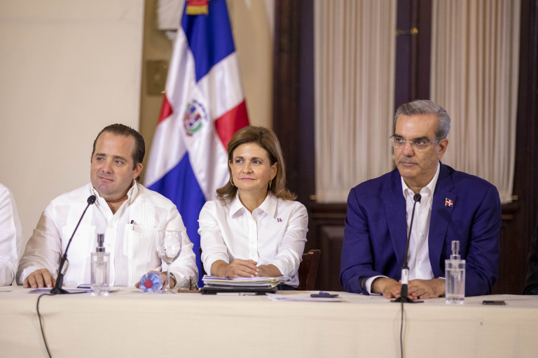 El presidente Luis Abinader, en compañía de la vicepresidenta Raquel Peña, ministros y otras autoridades, ofreció una rueda de prensa para informar sobre los avances en las labores de ayuda tras el paso del huracán #Fiona en el país. Santo Domingo, República Dominicana, 26 de Septiembre 2022. Vp/ Amehd Gitte
