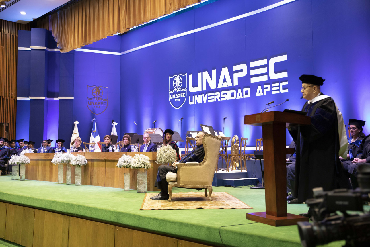 En representación del presidente Luis Abinader, la vicepresidenta Raquel Peña participó en la ceremonia de investidura del doctorado «honoris causa» en ciencias económicas y empresariales, otorgado por UNAPEC, al gobernador del Banco Central, Héctor Valdez Albizu. Santo Domingo, República Dominicana, 04 de Octubre 2022.