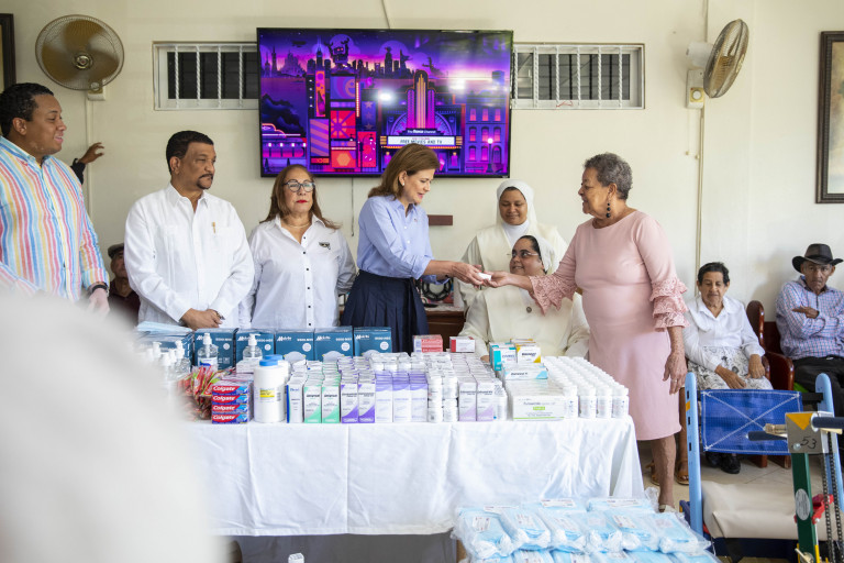 La vicepresidenta Raquel Peña hizo entrega de medicamentos, andadores y materiales gastables al hogar de ancianos San José, en Sajoma; junto al director de Salud del Gabinete de Política Social, Guillermo Moringlane. Santo Domingo, República Dominicana, 29 de Octubre 2022. Vp/ Amehd Gitte