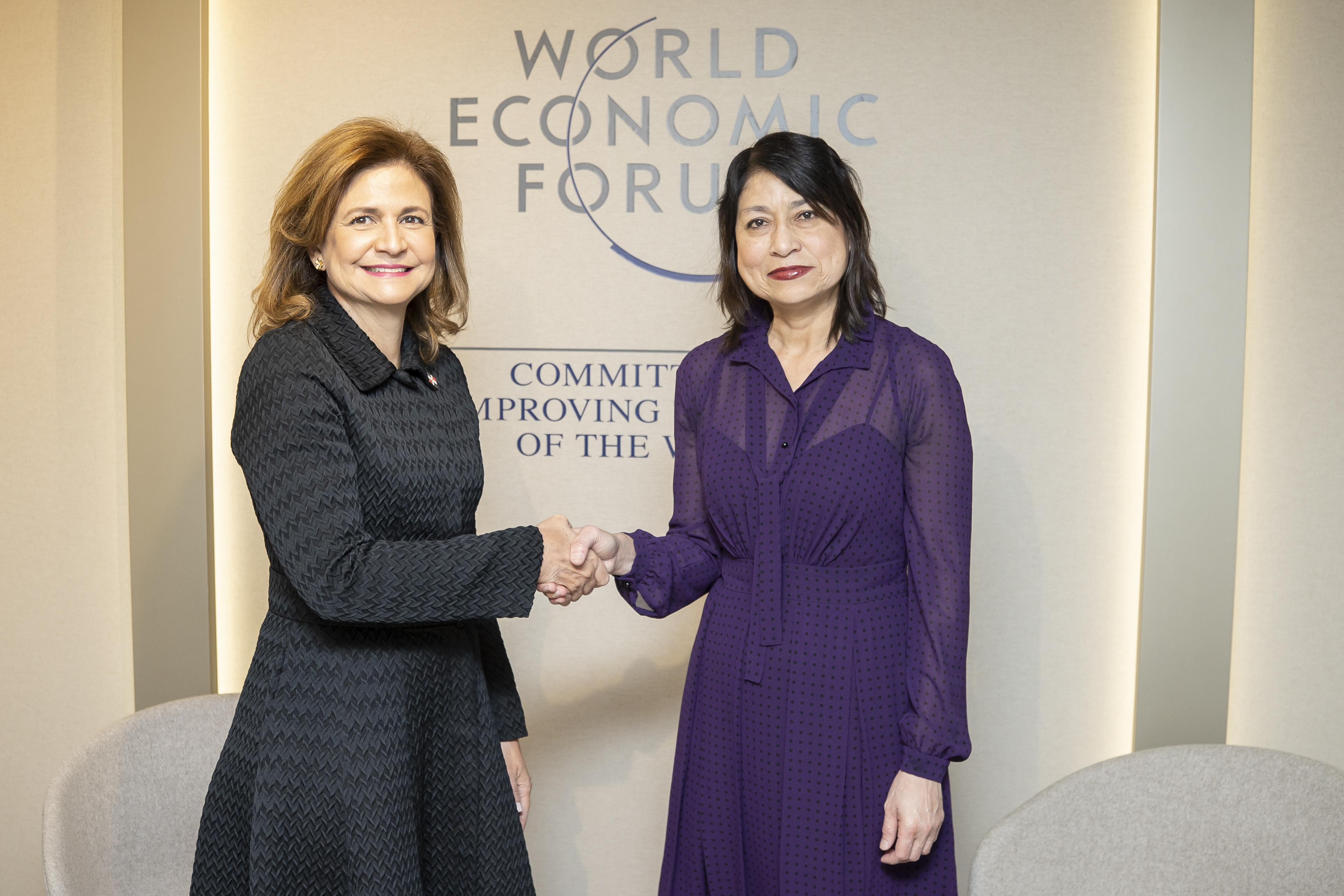 La Vpdta. Raquel Peña compartió con la ministra de Relaciones Exteriores de Perú, la Sra. Ana Cecilia Gervasi Díaz, durante las actividades del Foro Económico Mundial. Davos, Suiza. 18 de Enero 2023. Vp/ Jhon Escalante