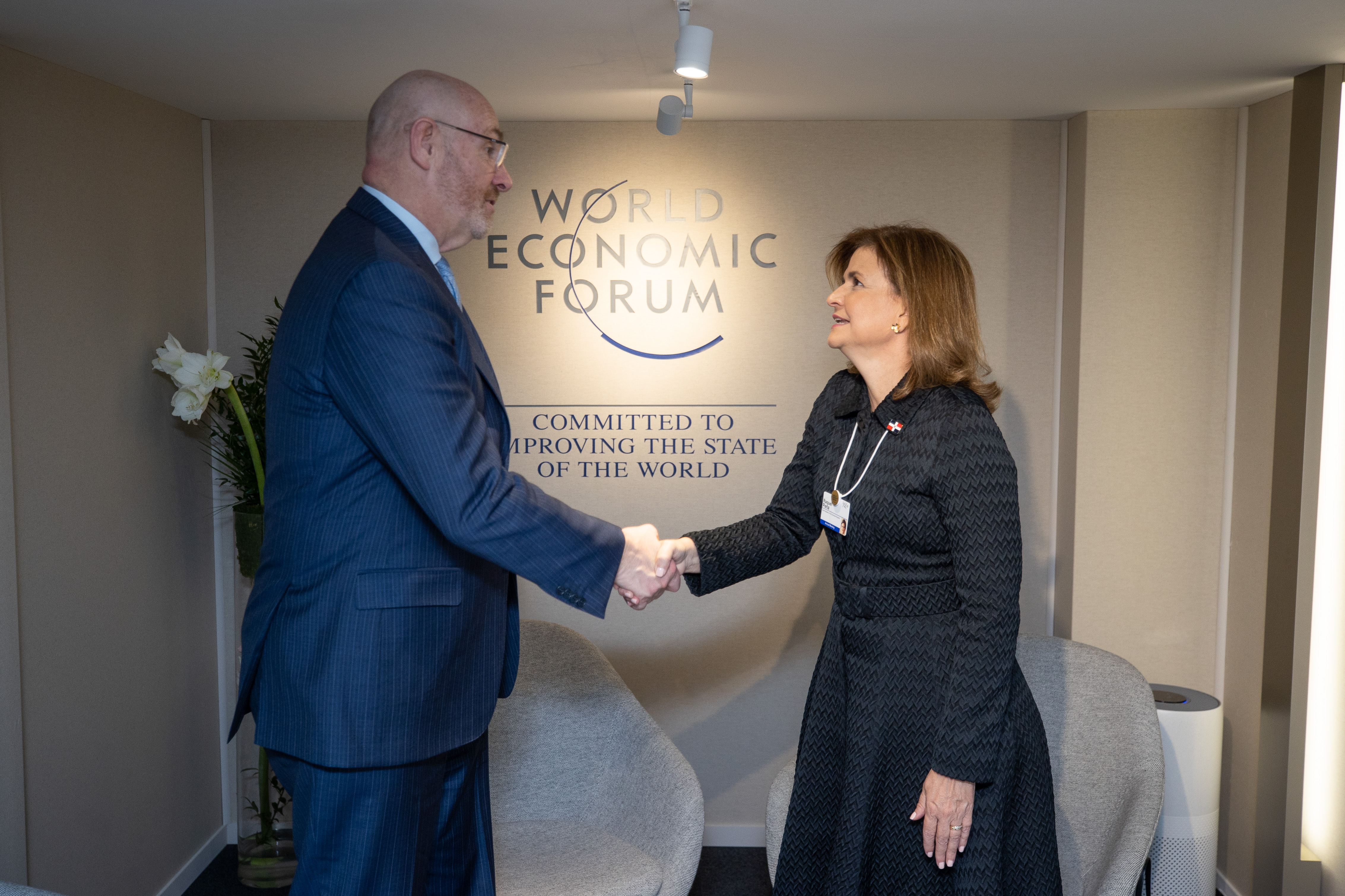 La vicepresidenta Raquel Peña estuvo reunida con el Sr. John Schultz, vicepresidente ejecutivo y director de Operaciones de Hewlett Packard Enterprise, durante el Foro Económico Mundial. Davos, Suiza, 18 de Enero 2023. Vp/ Jhon Escalante