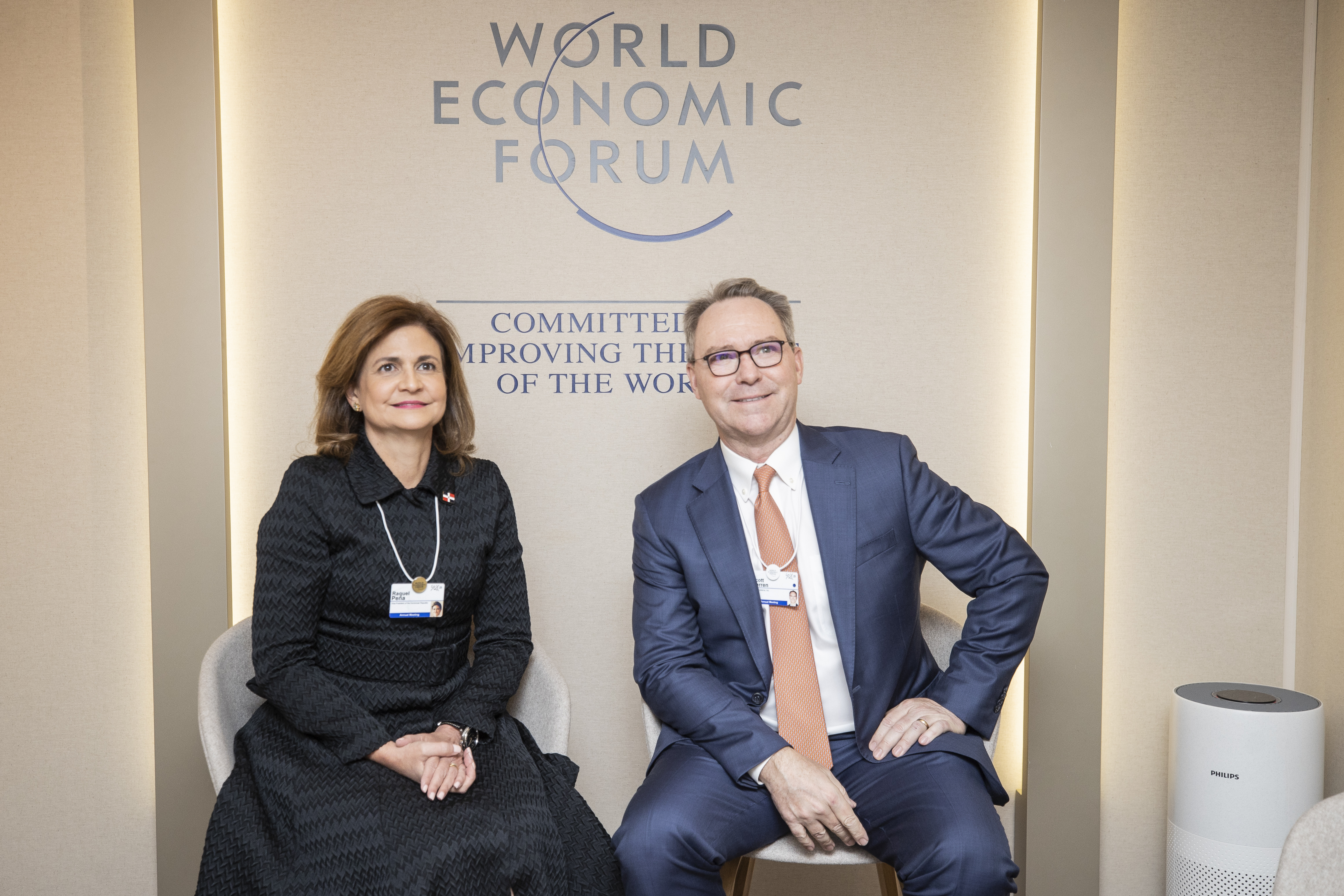La vicepresidenta Raquel Peña se reunió con el Sr. Scott Herren, vicepresidente ejecutivo y director financiero de Cisco, y el Sr. Jeff Sharritts, vicepresidente ejecutivo y director de Clientes y Socios de esta empresa, durante el Foro Económico Mundial. Davos, Suiza. 18 de Enero 2023. Vp/ Jhon Escalante
