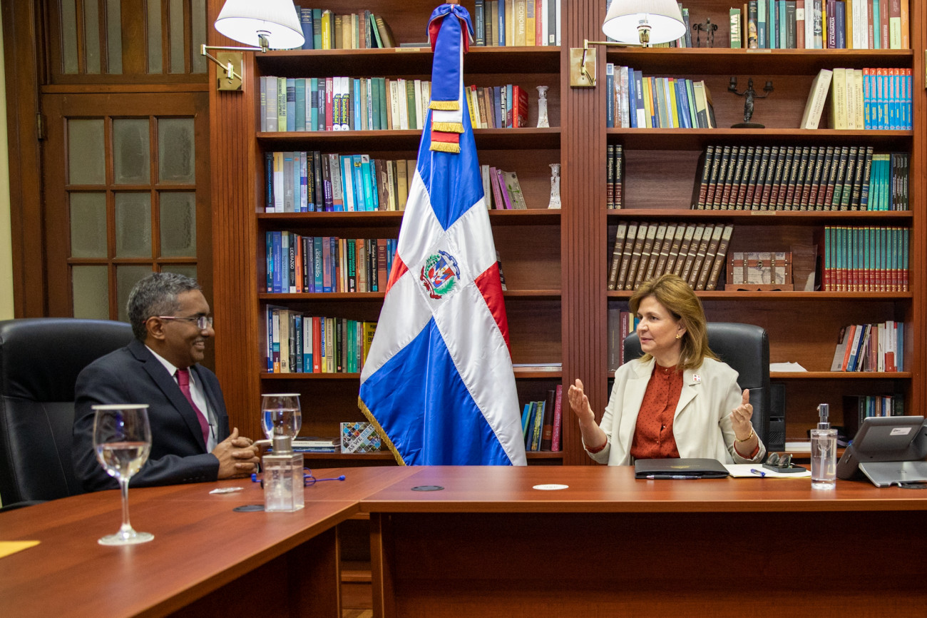 La vicepresidenta Raquel Peña recibió la visita del embajador de la India en el país, su excelencia Ramu Abbagani. En su reunión, conversaron sobre la relación entre ambas naciones y las diversas acciones impulsadas a favor del fomento de intercambios comerciales. Santo Domingo, República Dominicana, 10 de Marzo 2022. Vp/ Amehd Gitte