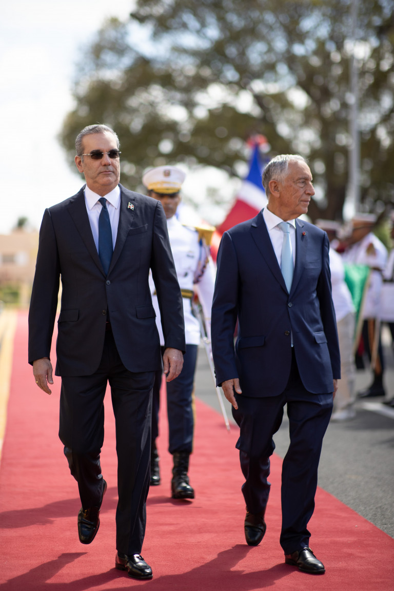 El presidente Luis Abinader en compañía de la vicepresidenta Raquel Peña y otros funcionarios, recibió en el Palacio Nacional al presidente de Portugal, el señor Marcelo Rebelo de Sousa, quien se encuentra en el país para participar en la XXVIII Cumbre Iberoamericana de Jefas y Jefes de Estado y de Gobierno. Santo Domingo, República Dominicana, 23 de Marzo 2023. Vp/ Jhon Escalante