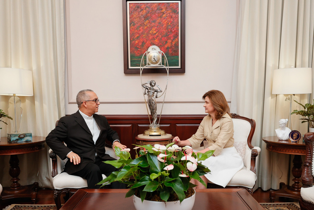 La vicepresidenta Raquel Peña recibió la visita de cortesía de monseñor Héctor Rodríguez Rodríguez, obispo de La Vega. 3 de Julio 2023. Santo Domingo República Dominicana. Vp/ Jhon Escalante