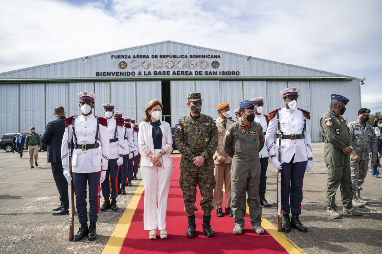 La vicepresidenta Raquel Peña le da la bienvenida al presidente Luis Abinader en la Base Aérea de San Isidro, quien asistió a la toma de posesión del nuevo gobernador de Puerto Rico, Pedro Pierluisi; en compañía del canciller Roberto Álvarez; el ministro administrativo de la Presidencia, José Ignacio Paliza; sus asistentes Eylin Beltrán y Mercedes Pichardo, así como el jefe del Cuerpo de Ayudantes, general Celin Rubio. Santo Domingo, República Dominicana. 2 de Enero 2021. Vp/ Jhon Escalante