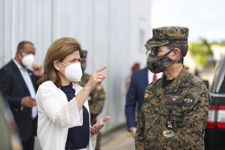 La vicepresidenta Raquel Peña le da la bienvenida al presidente Luis Abinader en la Base Aérea de San Isidro, quien asistió a la toma de posesión del nuevo gobernador de Puerto Rico, Pedro Pierluisi; en compañía del canciller Roberto Álvarez; el ministro administrativo de la Presidencia, José Ignacio Paliza; sus asistentes Eylin Beltrán y Mercedes Pichardo, así como el jefe del Cuerpo de Ayudantes, general Celin Rubio. Santo Domingo, República Dominicana. 2 de Enero 2021. Vp/ Jhon Escalante