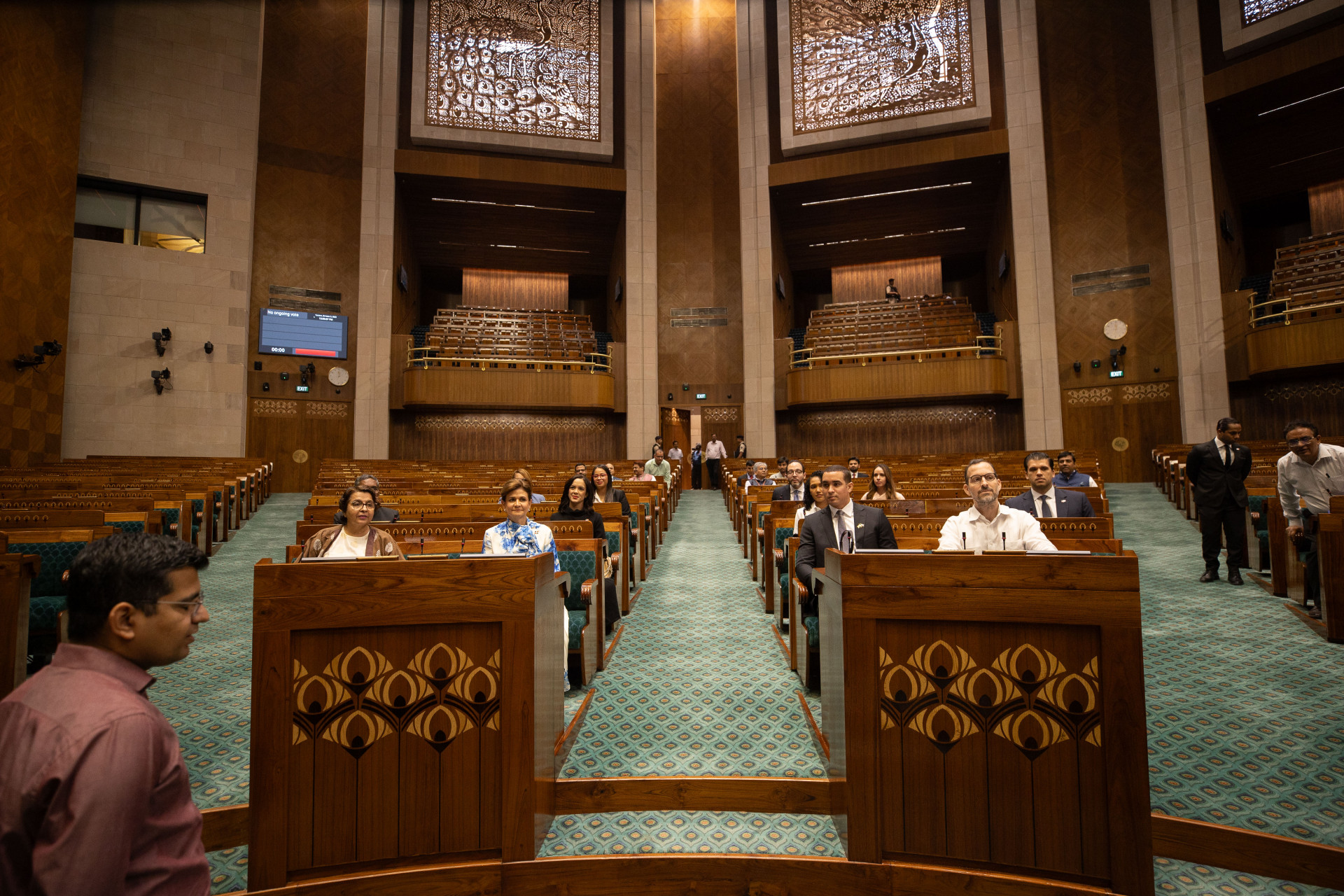 La vicepresidenta Raquel Peña visitó el nuevo parlamento indio para sostener un encuentro con el honorable presidente del Lok Sabha (la Cámara Baja), el señor Om Birla. Nueva Delhi, La India, 03 de Octubre 2023. Vp/ Jhon Escalante