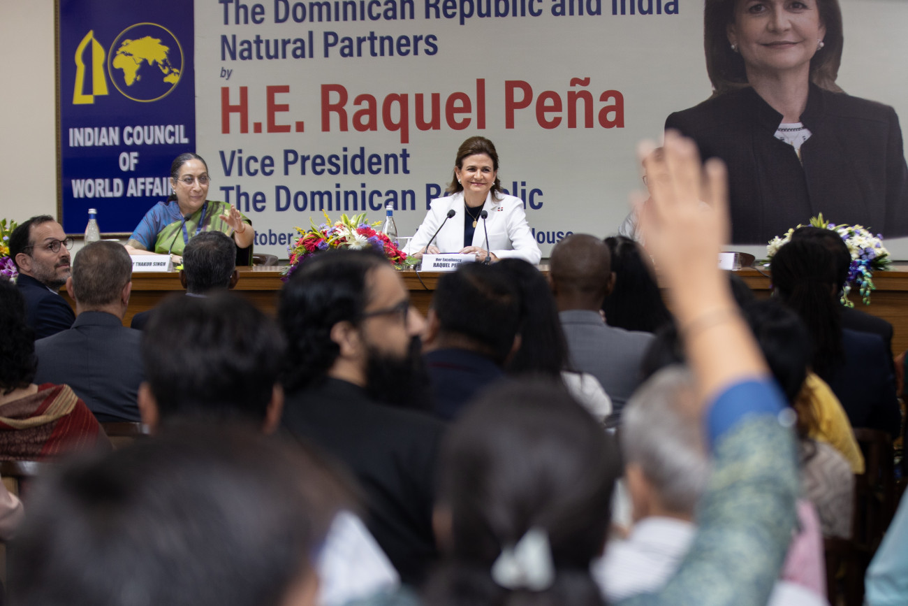 La vicepresidenta Raquel Peña estuvo en el Consejo Indio de Asuntos Mundiales (ICWA, por sus siglas en inglés), donde disertó frente a un auditorio compuesto por académicos, empresarios y diplomáticos, sobre los atributos y el potencial que hacen de la República Dominicana un destino atractivo para las inversiones en el Caribe. Nueva Delhi, La India, 04 de Octubre 2023. Vp/ Jhon Escalante