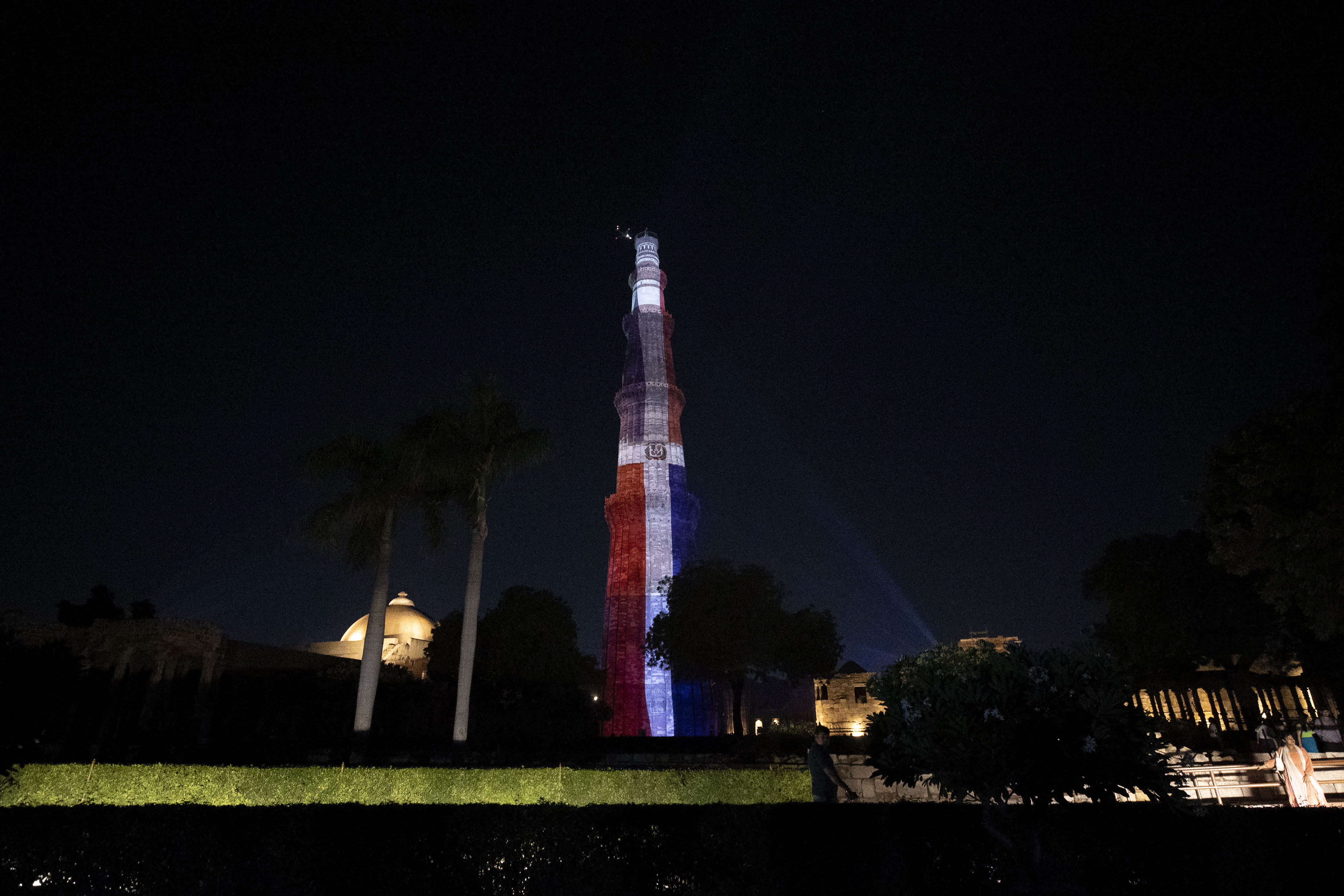 En ocasión de la visita de la vicepresidenta Raquel Peña a la República de la India y la celebración del 25 aniversario del establecimiento de las relaciones diplomáticas entre la RD y esa nación, nuestra insignia tricolor mostró todo su esplendor al exhibirse en el Qutab Minar, un monumento ubicado en Nueva Delhi, capital de la India. Nueva Delhi, La India, 04 de Octubre 2023. Vp/ Jhon Escalante