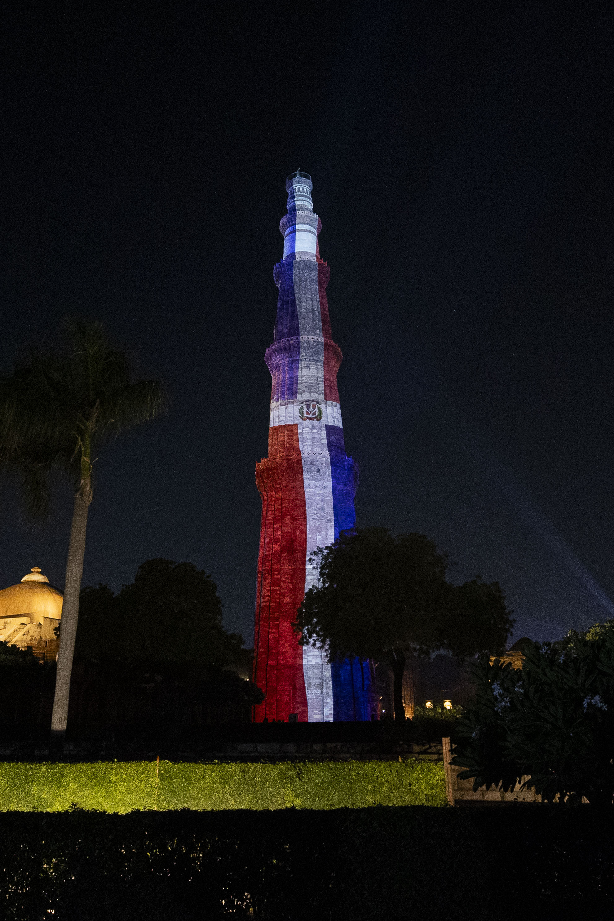 En ocasión de la visita de la vicepresidenta Raquel Peña a la República de la India y la celebración del 25 aniversario del establecimiento de las relaciones diplomáticas entre la RD y esa nación, nuestra insignia tricolor mostró todo su esplendor al exhibirse en el Qutab Minar, un monumento ubicado en Nueva Delhi, capital de la India. Nueva Delhi, La India, 04 de Octubre 2023. Vp/ Jhon Escalante