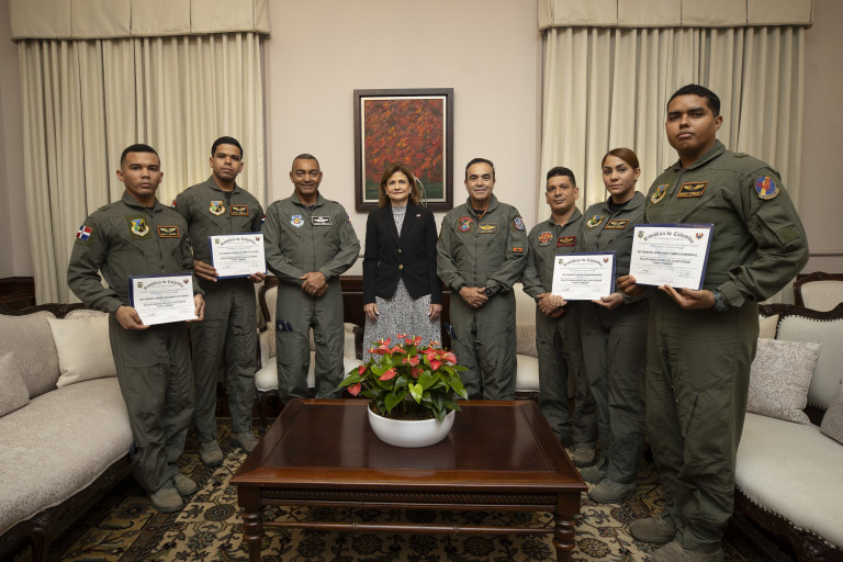 La vicepresidenta Raquel Peña impuso la distinción «Alas de Piloto Aviador» a cuatro oficiales de esta entidad, quienes completaron con éxito el curso «Alas Rotatorias» aplicado en helicópteros «TH-67 "CREEK"», en Colombia. Santo Domingo, República Dominicana, 16 de Octubre 2023. Vp/ Jhon Escalante