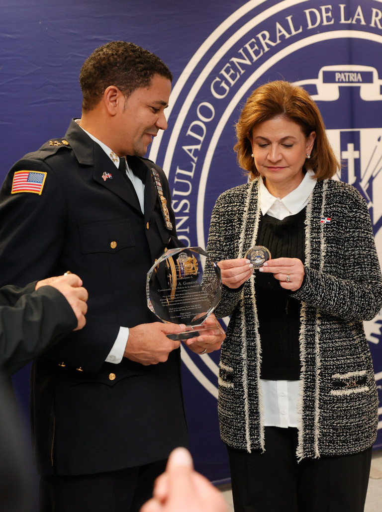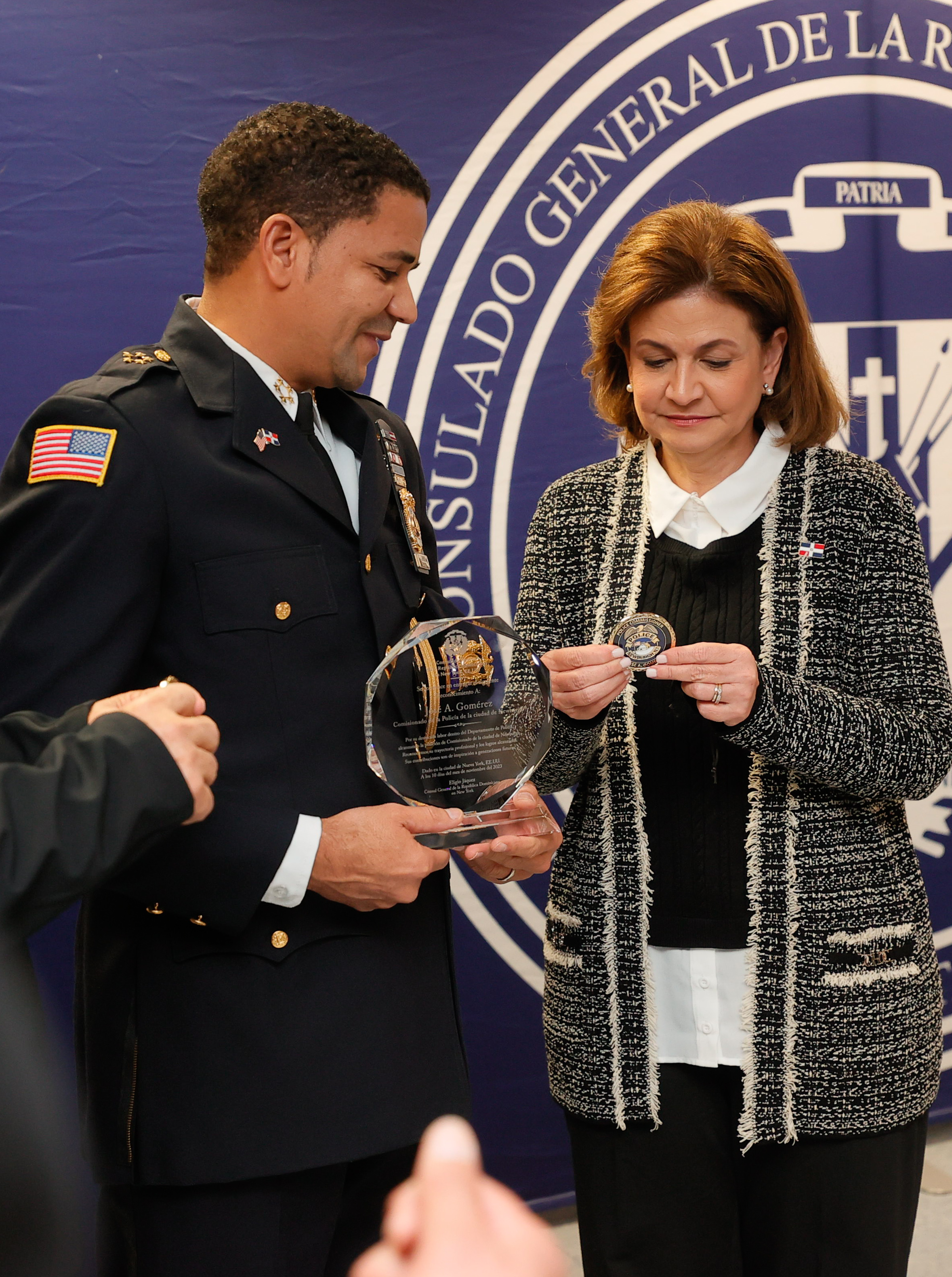La vicepresidenta Raquel Peña, junto al cónsul general de la República Dominicana en New York, EE. UU., el Sr. Eligio Jáquez, reconoció al Sr. José Gomérez, primer dominicano en ser comisionado de la Policía del Estado de New York. Asimismo, fue reconocida la Sra. Wendy García, primera dominicana en designarse comisionada de Equidad e Inclusión del Departamento de Policía de la ciudad de New York, que ha logrado el más alto rango a lo interno de este organismo. Santo Domingo, República Dominicana, 11 de Noviembre 2023. Vp/ Jhon Escalante