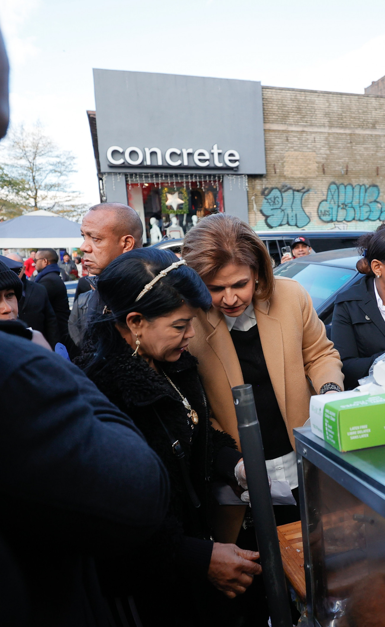 La vicepresidenta Raquel Peña, durante su visita a New York, visitó el Alto Manhattan y compartió con doña Nena, emprendedora con un puesto de habichuelas con dulce. Santo Domingo, República Dominicana, 11 de Noviembre 2023. Vp/ Jhon Escalante