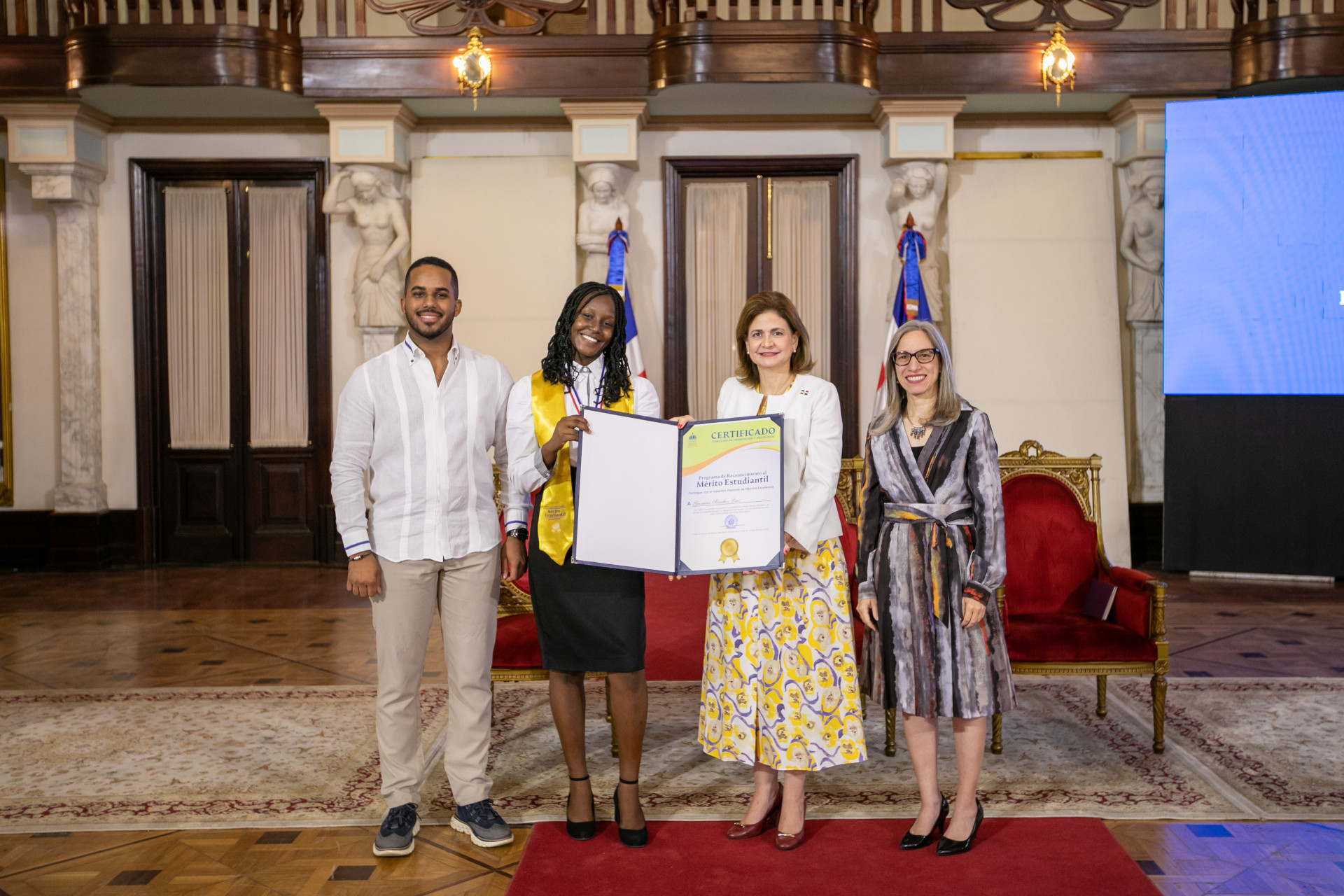 En representación del presidente Luis Abinader, la vicepresidenta Raquel Peña encabezó el acto de entrega del Reconocimiento al Mérito Estudiantil, otorgado por el Ministerio de Educación, que destaca el desempeño de jóvenes de todo el país por haber alcanzado el más alto nivel en sus calificaciones. Santo Domingo, República Dominicana. 17 de Noviembre 2023. VP/ Sintia Méndez