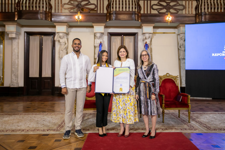 En representación del presidente Luis Abinader, la vicepresidenta Raquel Peña encabezó el acto de entrega del Reconocimiento al Mérito Estudiantil, otorgado por el Ministerio de Educación, que destaca el desempeño de jóvenes de todo el país por haber alcanzado el más alto nivel en sus calificaciones. Santo Domingo, República Dominicana. 17 de Noviembre 2023. VP/ Sintia Méndez