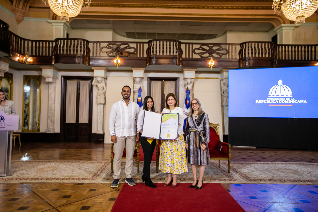 En representación del presidente Luis Abinader, la vicepresidenta Raquel Peña encabezó el acto de entrega del Reconocimiento al Mérito Estudiantil, otorgado por el Ministerio de Educación, que destaca el desempeño de jóvenes de todo el país por haber alcanzado el más alto nivel en sus calificaciones. Santo Domingo, República Dominicana. 17 de Noviembre 2023. VP/ Sintia Méndez