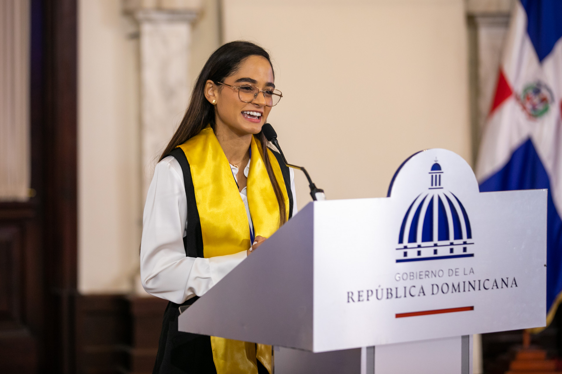 En representación del presidente Luis Abinader, la vicepresidenta Raquel Peña encabezó el acto de entrega del Reconocimiento al Mérito Estudiantil, otorgado por el Ministerio de Educación, que destaca el desempeño de jóvenes de todo el país por haber alcanzado el más alto nivel en sus calificaciones. Santo Domingo, República Dominicana. 17 de Noviembre 2023. VP/ Sintia Méndez