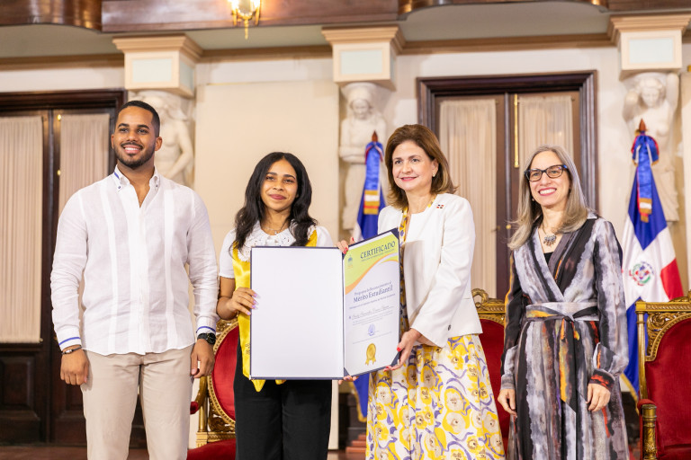 En representación del presidente Luis Abinader, la vicepresidenta Raquel Peña encabezó el acto de entrega del Reconocimiento al Mérito Estudiantil, otorgado por el Ministerio de Educación, que destaca el desempeño de jóvenes de todo el país por haber alcanzado el más alto nivel en sus calificaciones. Santo Domingo, República Dominicana. 17 de Noviembre 2023. VP/ Pedro Rodríguez