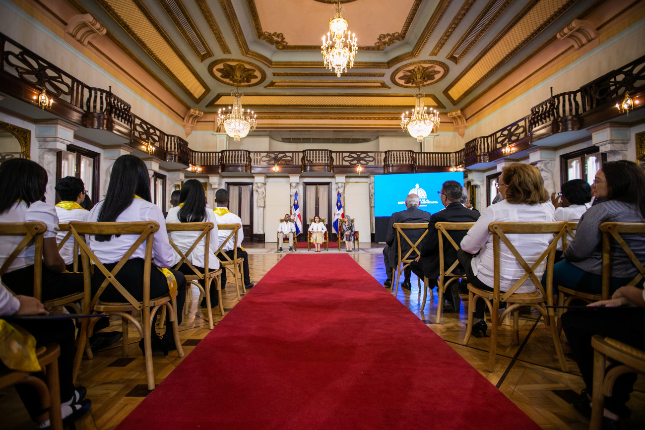 En representación del presidente Luis Abinader, la vicepresidenta Raquel Peña encabezó el acto de entrega del Reconocimiento al Mérito Estudiantil, otorgado por el Ministerio de Educación, que destaca el desempeño de jóvenes de todo el país por haber alcanzado el más alto nivel en sus calificaciones. Santo Domingo, República Dominicana. 17 de Noviembre 2023. VP/ Sintia Méndez