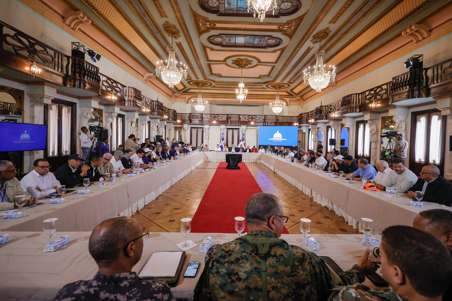 Como parte del seguimiento a las acciones que el Gobierno ha desplegado para mitigar los daños por el paso del fenómeno atmosférico en el país, el presidente Luis Abinader encabezó una reunión junto a la vicepresidenta Raquel Peña, ministros y autoridades de los organismos de emergencia. Santo Domingo, República Dominicana. 19 de Noviembre 2023. VP/ Jhon Escalante
