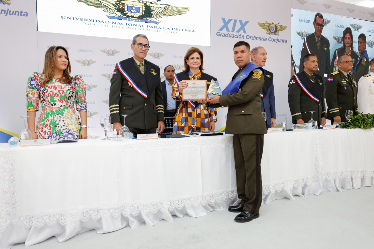 En representación del presidente Luis Abinader, la vicepresidenta Raquel Peña encabezó el acto de la XIX graduación ordinaria conjunta de la Universidad Nacional para la Defensa "general Juan Pablo Duarte y Díez, en la que 2754 civiles y militares obtuvieron sus títulos en los niveles de postgrado, educación continua y pasantía militar fronteriza. Santo Domingo, República Dominicana, 7 de Diciembre 2023. Vp/ Felix Hirujo