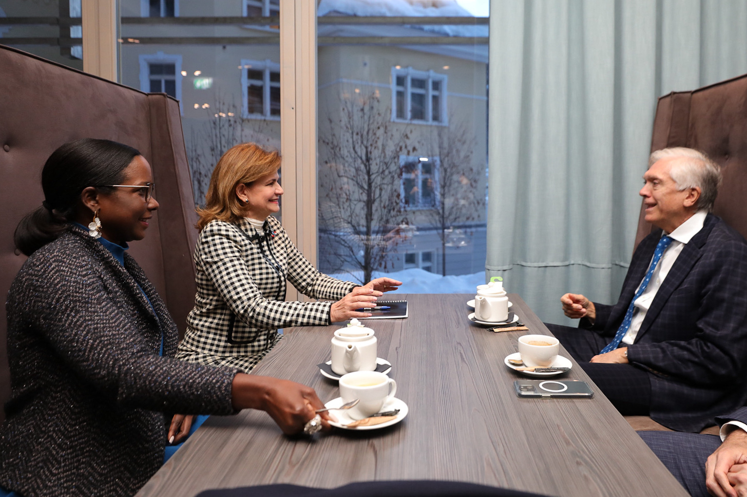 En el marco de la 54.ª Reunión Anual del Foro Económico Mundial, la vicepresidenta Raquel Peña conversó con el señor Andrés Gluski, presidente de la empresa AES Corporation. Dialogaron sobre temas que seguirán impulsando la relación establecida con la República Dominicana. Davos, Suiza. 16 de enero 2024. VP/ Jhon Escalante
