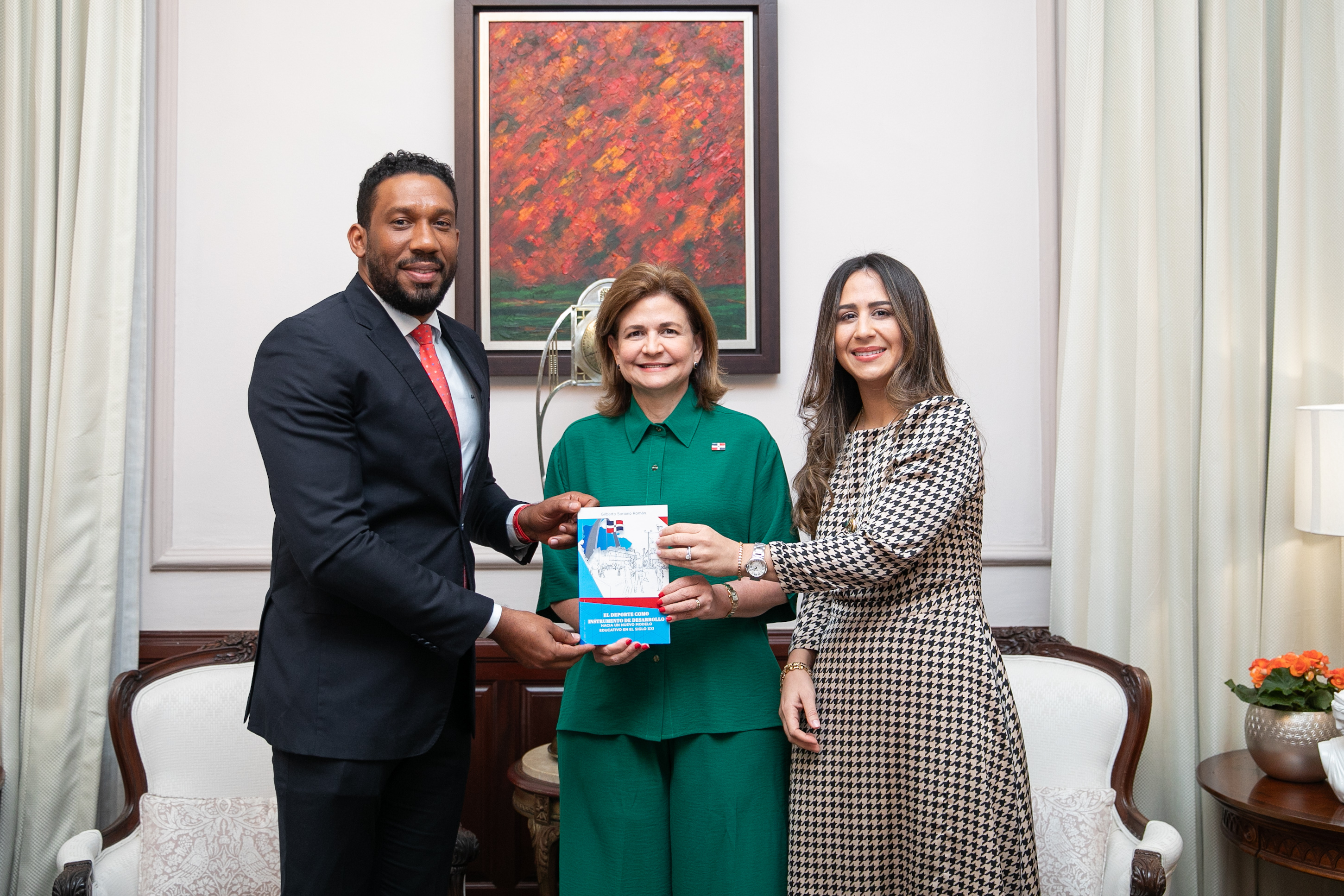 La vicepresidenta Raquel Peña recibió la visita del señor Gilberto Soriano, presidente de la Asociación Dominicana del Derecho Deportivo, quien junto a la señora Juliana Ramia Capellán le hicieron entrega del ejemplar del libro «El Deporte como Instrumento de Desarrollo». Santo Domingo, República Dominicana. 23 de Enero 2024. VP/ Sintia Méndez