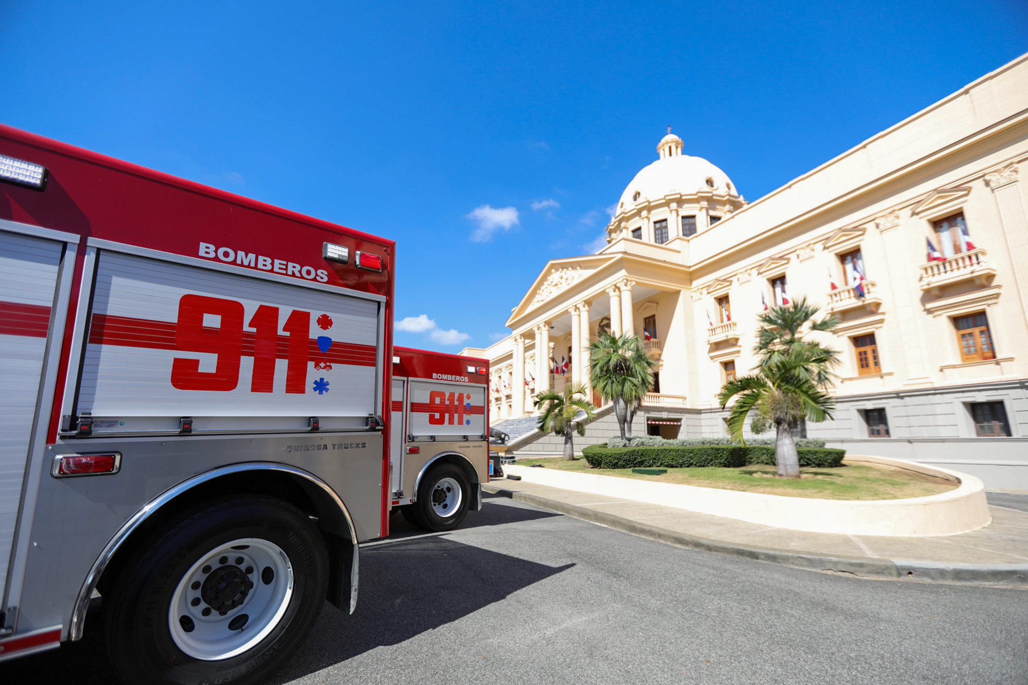 En representación del presidente Luis Abinader, la vicepresidenta Raquel Peña, junto al ministro Joel Santos y el ministro Chu Vásquez, entregó 11 camiones de última generación a varias entidades de cuerpos de bomberos del país, con los que se podrán realizar las labores de manera más eficiente y segura. Santo Domingo, República Dominicana. 15 de Febrero 2024. VP/ Amehd Gitte