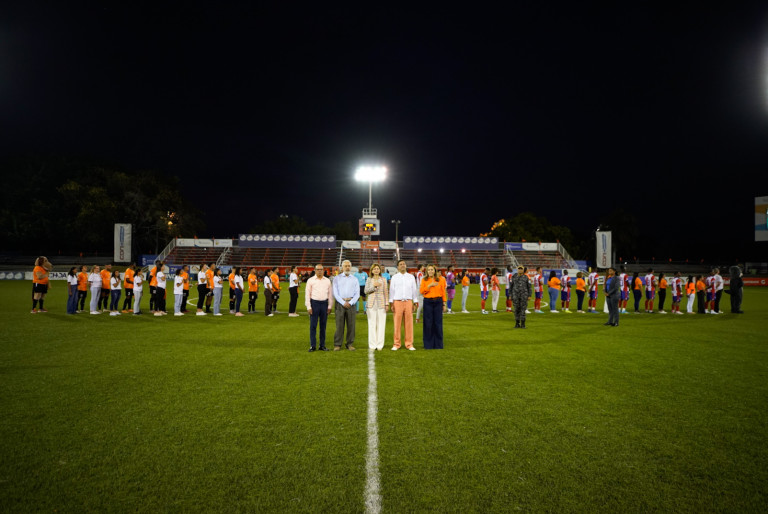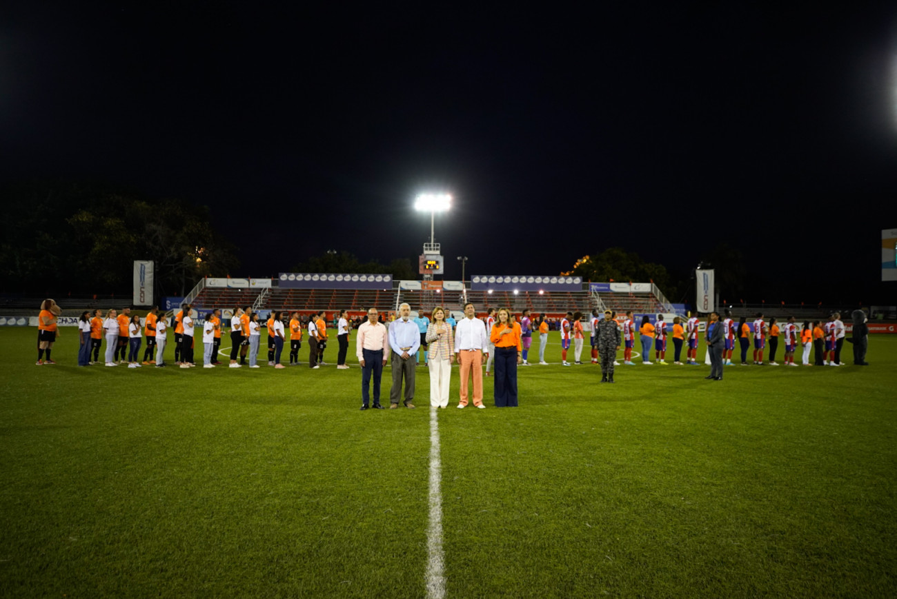 En representación de la mujer dominicana y como una forma de continuar incentivando las buenas prácticas deportivas en el país, la vicepresidenta Raquel Peña realizó hoy el saque de honor del primer juego de inicio de temporada de la Liga Dominicana de Fútbol, entre el Cibao FC y los Delfines de La Guaira en Santiago. Santiago, República Dominicana. 08 de Marzo del 2024. VP/ Jhon Escalante