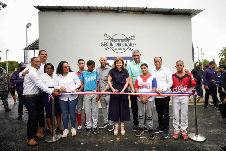 La vicepresidenta Raquel Peña inaugurados, de manera simultánea, el campo de béisbol «Secundino González» y el campo de sóftbol «Félix Reynoso», espacios que beneficiarán a más de 800 jugadores y permitirán la recreación y el sano esparcimiento de niños y jóvenes de Sabaneta, en Nagua, República Dominicana, 16 de Marzo 2024. Vp/ Jhon Escalante