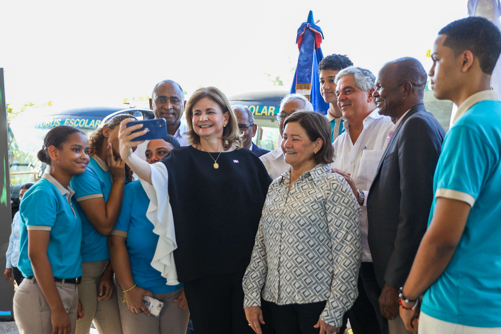 La vicepresidenta Raquel Peña encabezó el acto de lanzamiento del Transporte Estudiantil (TRAE) en Baní, República Dominicana, 18 de Marzo 2024. Vp/ Sintia Mendez