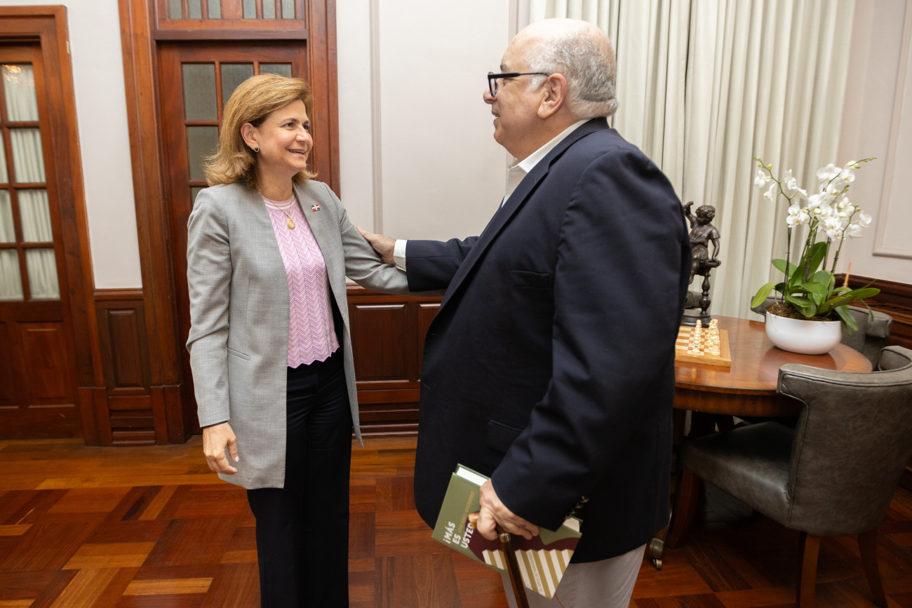 La vicepresidenta Raquel Peña recibió la visita del abogado y periodista José Báez Guerrero, con quien dialogó sobre su reciente obra, el libro «¡Más es usted!», que recopila relatos y anécdotas que resumen su experiencia al abordar y entrevistar a diversas personalidades del ámbito político y empresarial, a través de sus 45 años de trayectoria profesional. Santo Domingo, República Dominicana, 04 de Abril 2024. Vp/ Felix Hirujo