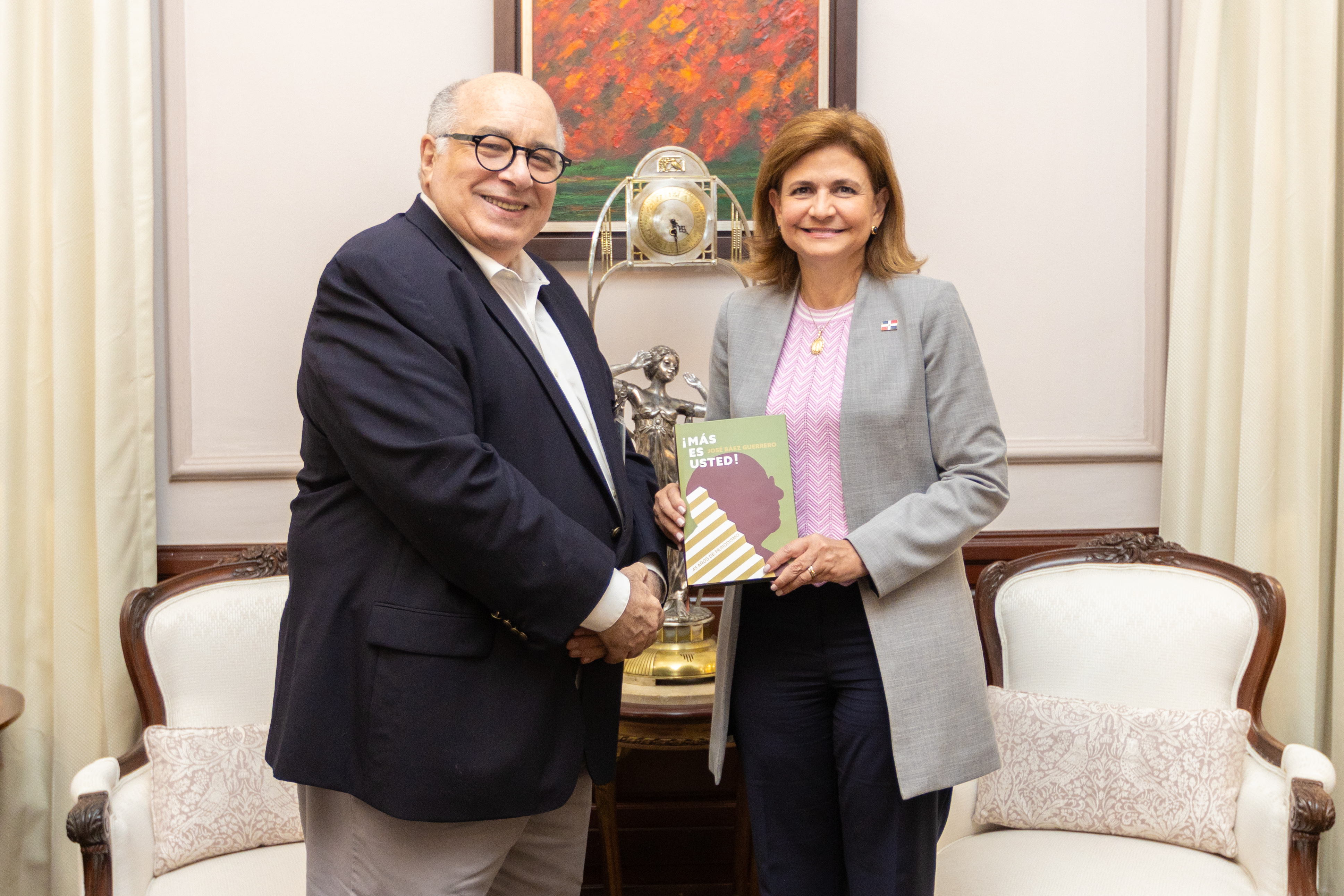La vicepresidenta Raquel Peña recibió la visita del abogado y periodista José Báez Guerrero, con quien dialogó sobre su reciente obra, el libro «¡Más es usted!», que recopila relatos y anécdotas que resumen su experiencia al abordar y entrevistar a diversas personalidades del ámbito político y empresarial, a través de sus 45 años de trayectoria profesional. Santo Domingo, República Dominicana, 04 de Abril 2024. Vp/ Felix Hirujo