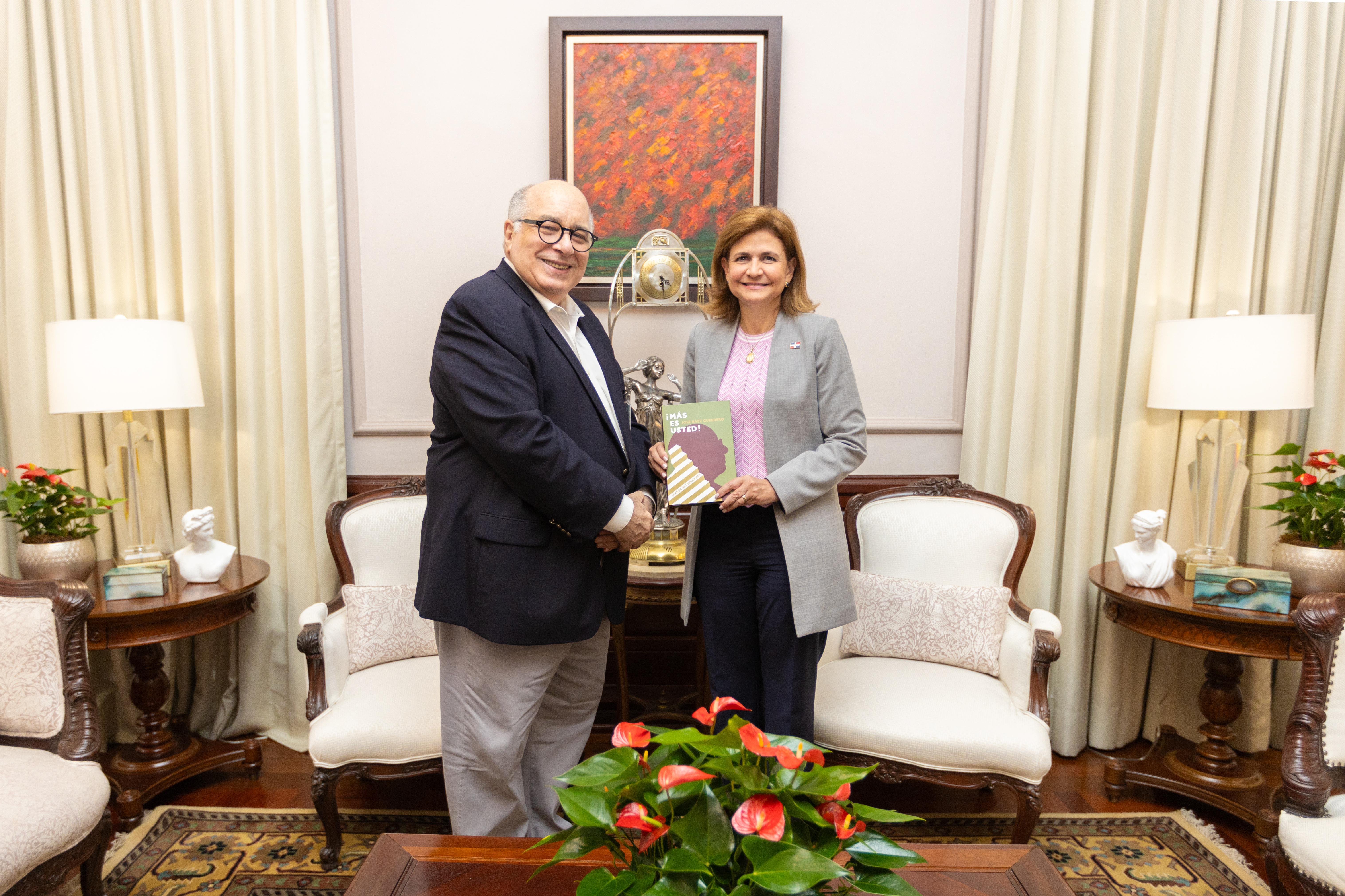 La vicepresidenta Raquel Peña recibió la visita del abogado y periodista José Báez Guerrero, con quien dialogó sobre su reciente obra, el libro «¡Más es usted!», que recopila relatos y anécdotas que resumen su experiencia al abordar y entrevistar a diversas personalidades del ámbito político y empresarial, a través de sus 45 años de trayectoria profesional. Santo Domingo, República Dominicana, 04 de Abril 2024. Vp/ Felix Hirujo