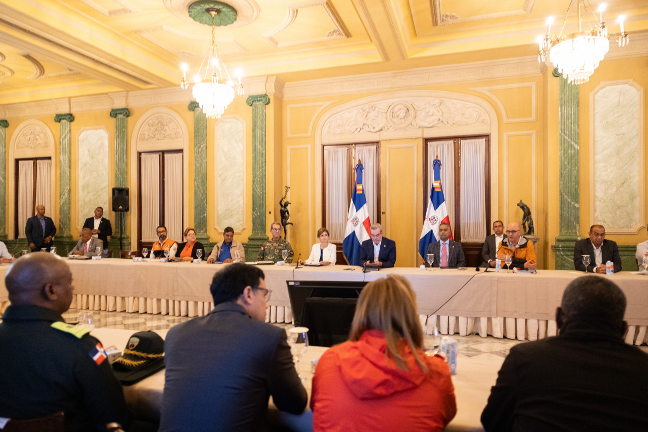 El presidente Luis Abinader, en compañía de la vicepresidenta Raquel Peña, encabezó una reunión con representantes de los organismos de socorro y entidades relacionadas para evaluar acciones que permitan hacer frente a la situación climática actual. Santo Domingo, República Dominicana, 09 de Mayo 2024. Vp/ Felix Hirujo
